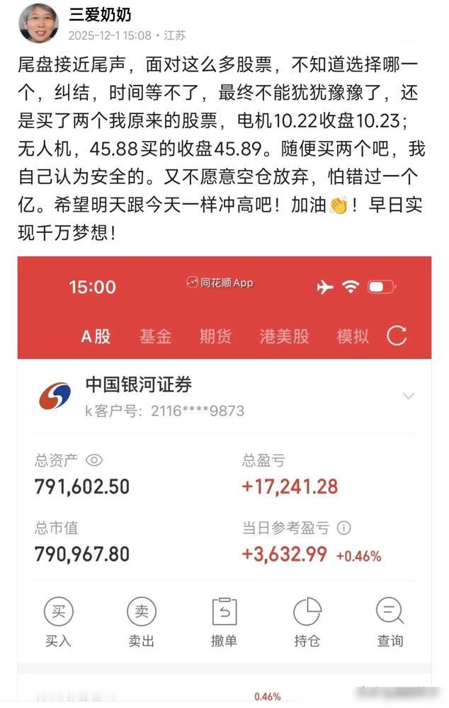 三爱奶奶尾盘又把电机和无人机股全仓买回来了,必竟总资产到79万了,应该想是明天冲一冲80万。 大盘今天指数给力3914点,上涨接近3400家。 看到这个操作,真是让人捏把汗。全仓押注单一板块,哪怕是自己熟悉的股票,风险也像悬在头顶的剑。市场普涨的日子,喜悦之下更需要一份冷静。 这位投资者瞄准的电机和无人机板块,近来确实话题不少。无人机在物流、测绘等领域应用越来越广,电机更是工业的基础部件。但热点往往伴随着高波动。前几天这两个板块刚经历一轮调整,这么快就全仓杀回,赌性有点重了。尤其是尾盘操作,更像是追着当天涨幅去的,容易买在高点。 大盘站上3900点,表面一片繁荣。但指数反弹到五周线附近,这是个敏感位置。五周线可以看作短期市场的生命线。上去,可能打开一段上涨空间;上不去,回调的压力就大了。今天证券股下午的异动,也说明大资金在这里也很犹豫,多空双方都在试探。 全仓搏明天冲上80万,这个心态很危险。投资不是赌明天开盘的涨跌。把短期账户数字的变化当成目标,很容易被情绪牵着鼻子走。市场最不缺的就是意外,一个低开就可能让计划全盘落空。真正的风险控制,是在市场狂欢时留一份清醒,在别人恐惧时才有底气出手。 这种“战战兢兢”的感觉,恰恰说明操作模式出了问题。如果投资让你每天都感到煎熬,那说明策略可能超出了承受能力。稳健的增长,远比刺激的过山车来得长久。 投资终究是场马拉松。比的不是某一天跑得多快,而是能否安全到达终点。守住本金,在确定性中寻找机会,才是普通投资者最该修炼的内功。