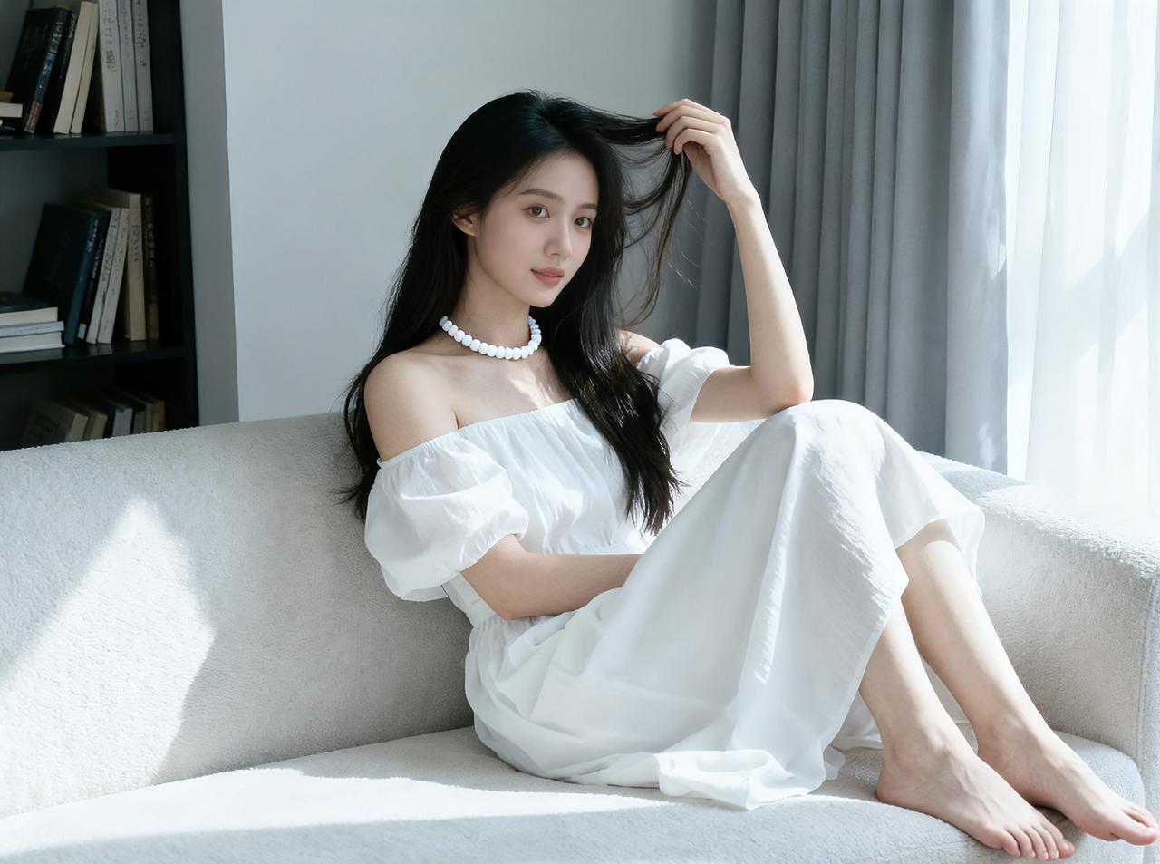款式采用宽松的一字肩设计,巧妙露出肩颈线条。袖子为蓬松的泡泡短袖,裙身带有褶皱肌理。整体版型轻盈宽松,长度在大腿中部。风格清新且带有温柔的松弛感,搭配颈间的白色珍珠项链,更凸显出干净甜美的气质。