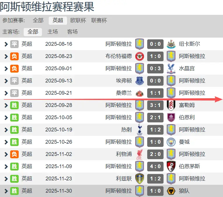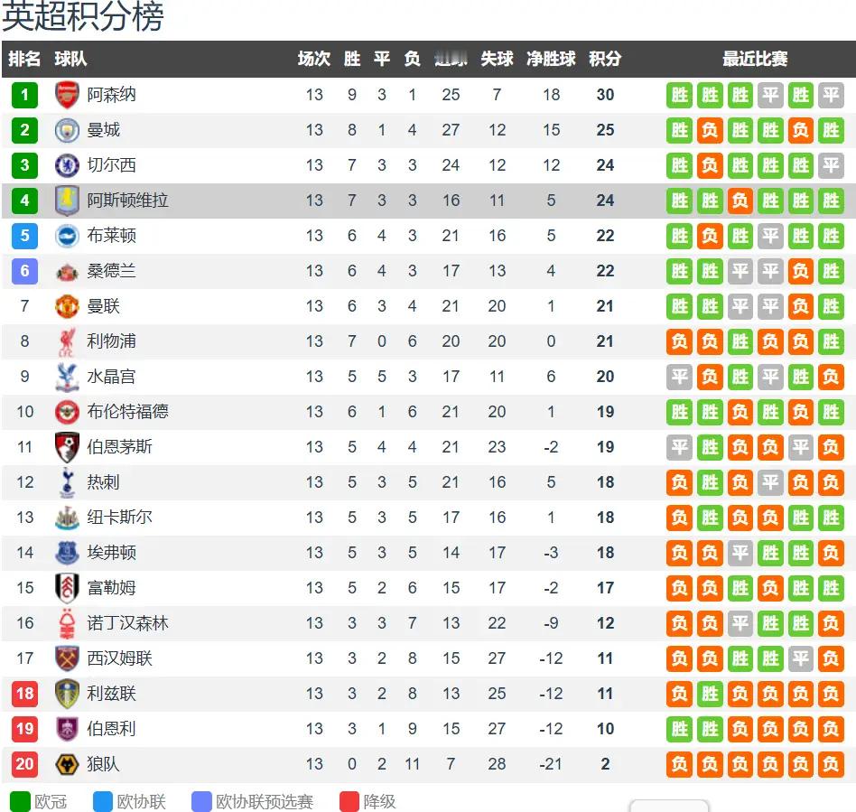 从开局5轮不胜深陷降级区,到近8轮豪取21分跻身欧冠区,埃梅里治下的阿斯顿维拉上演了英超最惊艳的逆袭剧本。英超第13轮,维拉主场1-0力克狼队,将联赛三连胜收入囊中。本赛季前5轮,维拉仅交出3平2负、积3分的惨淡成绩单,排名一度跌至英超倒数第三;但自第6轮起,球队触底反弹,8轮联赛打出7胜1负的强势表现(唯一失利是不敌低谷中的利物浦),狂揽21个积分。如今维拉以24分位列英超第四,与切尔西同分,距离第二名曼城仅1分之差。本赛季英超欧冠区争夺已进入白热化阶段,从第二名曼城到第八名利物浦,分差仅4分,埃梅里的球队无疑是欧冠席位的有力竞争者。英超联赛