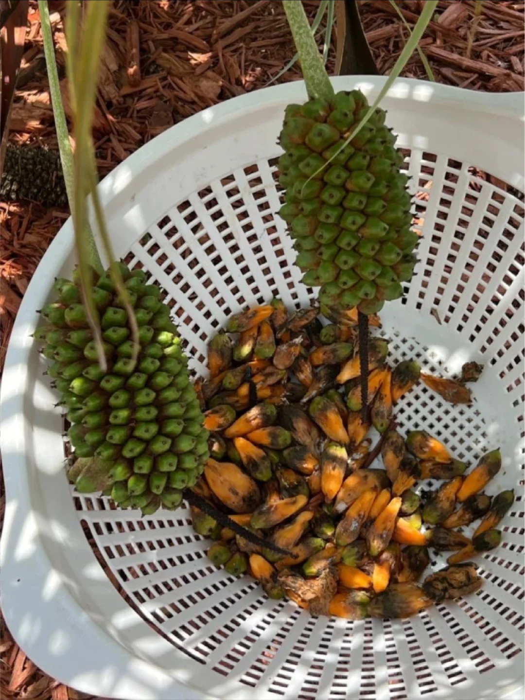 它的果实相当美味,幼果里面含有像椰子一样的水,成熟的果实很甜,有淡淡的 syagrus romanzffiana 果实的味道。