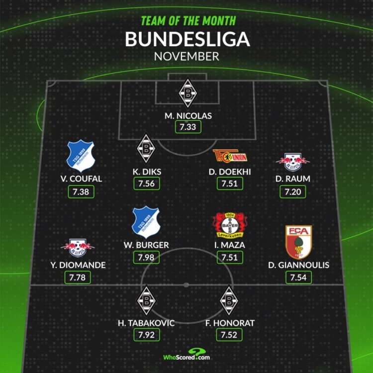 whoscored德甲11月最佳阵:迪奥曼德、马扎、劳姆领衔,门兴4将