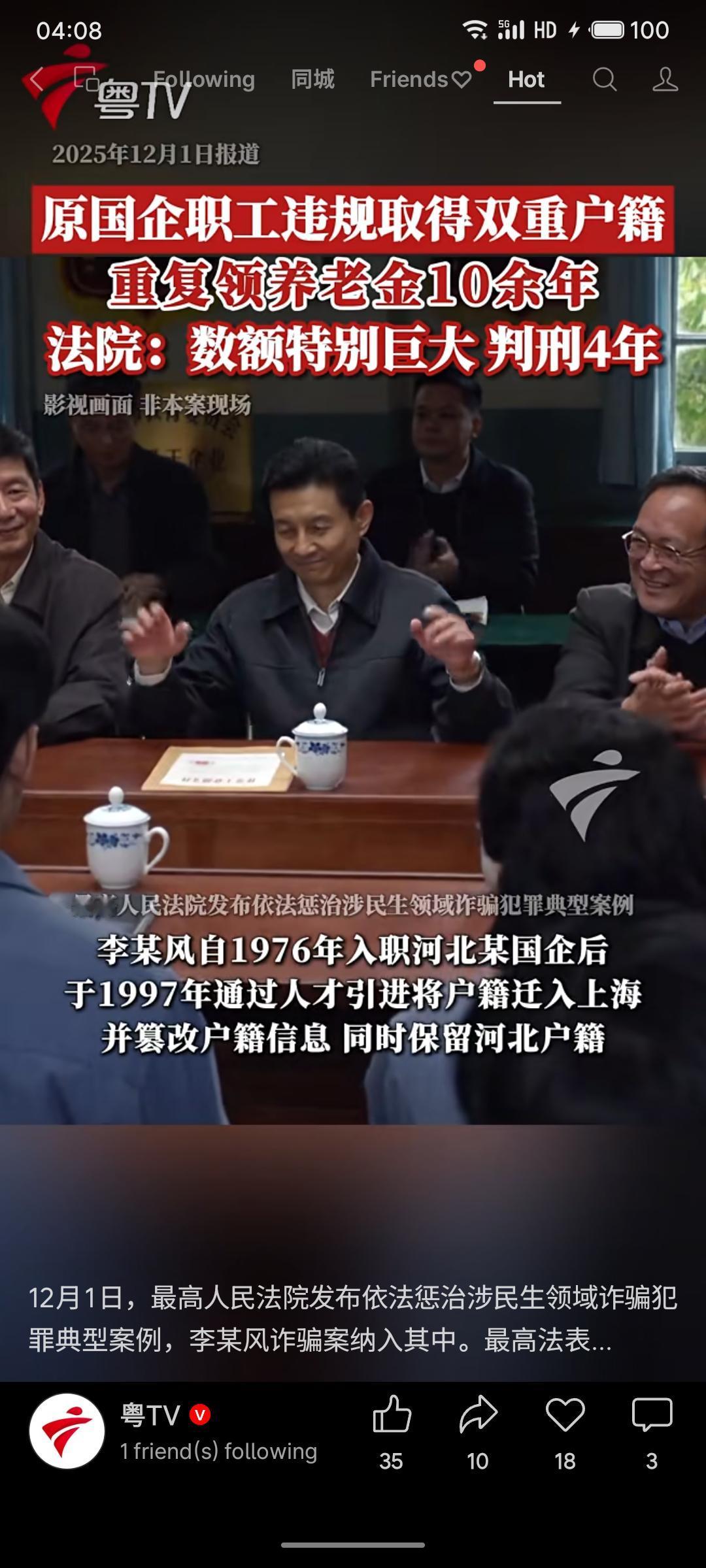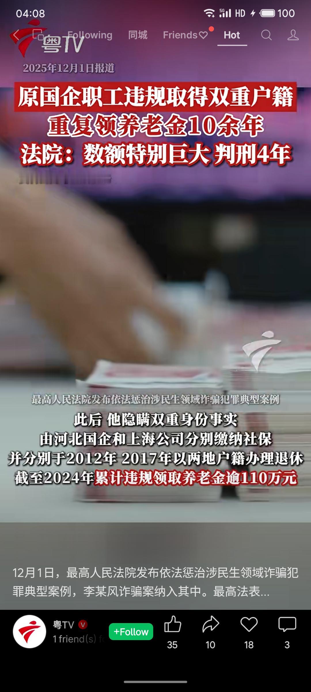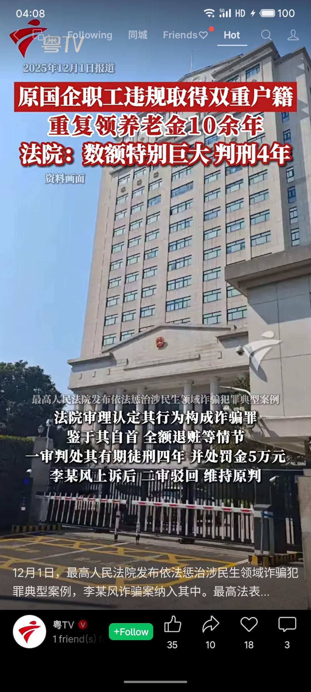 原国企职工李某风通过篡改信息保留河北、上海双重户籍,并在两地分别缴纳社保、办理退休,十余年间累计违规领取养老金逾110万元。其行为构成诈骗罪,鉴于自首、退赃,终审判处有期徒刑四年并处罚金。此案被最高法列为涉民生诈骗典型案例。