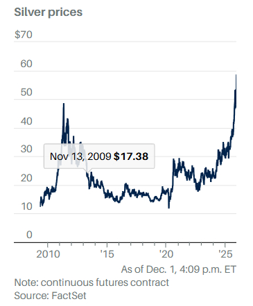 201市场综述:美股12月开局不利全面下跌,分析师寄希望于圣诞行情,白银高歌猛进美股美股白银 在连续五天上涨后,美股在12月以下跌开局。标准普尔500指数下跌0.5%,道琼斯指数下跌0.9%,纳斯达克指数下跌0.4%。跌幅最大的是公用事业板块,这一板块通常被视为股市中最安全的领域之一,这表明市场正出现全面抛售。谨慎情绪延续了近期全球市场的波动。今年秋季,围绕人工智能泡沫的担忧引发市场震荡。尽管黑色星期五当日股市上涨,标普500指数在11月仍仅小幅上涨,实现连续第七个月上涨。为海外华人提供有价值的信息与分析,更多内容和全文可在蓝天、电报、x查找causmoney,或直接谷歌搜索道琼斯工业指数落后,主要受到部分医疗保健股和高盛集团股票拖累。制药公司安进和默克是当日道指表现最差的两只股票。近期,制药行业面临关税审查,同时,美国食品药品监督管理局(FDA)一份报告将新冠疫苗与一种心脏疾病联系起来,打击了疫苗类股票。医疗保健板块是当天道指中表现倒数第二的板块。与此同时,高盛股价下跌1.8%。此前,这家投行宣布将以20亿美元收购ETF提供商Innovator Capital Management。由于道琼斯指数是按股价加权计算,而高盛的股价在指数成分股中最高,因此这个股票的下跌对整个指数带来了较大下行压力。不仅是股市,债市也没啥好开端。两年期美国国债收益率上涨5个基点至3.53%。10年期美国国债收益率上涨8个基点至4.09%。30年期美国国债收益率上涨8个基点至4.74%。热门美国国债ETF——iShares 20年以上期美国国债基金,下跌了1.6%。这意味着,通常被视为更安全投资的债券,并未在股市下跌时提供缓冲。日本股市和债市均下跌,日本央行行长暗示本月晚些时候可能加息。个股和公司方面,Shopify股价下跌,此前这家电商平台表示,一些商户在使用销售终端系统时遇到问题。周一股价下跌5.9%,至149.28美元。今年以来累计上涨44%。英伟达向芯片设计软件制造商新思科技投资20亿美元。OpenAI将持有Thrive Holdings的股权。这家投资工具公司由Thrive Capital今年早些时候设立,ChatGPT开发商与支持者之间的循环交易名单变得越来越长。DeepSeek推出其实验性人工智能模型的两个新版本,增加了新功能,称将有助于提升推理能力,并能自主执行特定操作。Strategy公司宣布设立14亿美元储备,用于未来支付股息和利息,试图缓解外界对公司在币价持续下跌时可能被迫出售其约560亿美元加密资产的担忧。First Digital Group计划通过与一家空白支票公司合并上市。随着加密货币企业开始利用更有利的监管环境,这类公司正在寻求进入股票市场。礼来公司再次下调减重药Zepbound入门剂量的售价,随着竞争对手诺和诺德加大市场攻势,竞争日益激烈。Moderna股价下跌,此前美国食品药品监督管理局上周晚些时候发布备忘录,表示将对哪些疫苗可上市施加新限制。巴里克矿业公司正考虑将其在北美的优质黄金资产进行IPO,这部分资产估值可能超过600亿美元。公司当前正面临采矿困境和管理层动荡。全球最大床上用品公司Somnigroup International提出以约16亿美元的全股票交易收购最大供应商之一——Leggett & Platt公司。空客公司已通知客户,数百架A320neo系列飞机将需进行检查,以排查与供应商制造工艺缺陷相关的潜在结构问题。据知情人士透露,必和必拓曾出价约400亿英镑(530亿美元)试图收购英美资源公司,但交易现已告吹。韩国最大电商Coupang发生大规模数据泄露事件,为韩国今年网络泄露纪录再添一笔。全球最大电动车制造商比亚迪的销量连续第三个月下滑,面临对手推出热门车型所带来的激烈竞争。经济和贸易方面,美国制造业的疲软已经开始影响到就业。美国供应管理协会(ISM)发布的采购经理人指数(PMI)在11月为48.2,低于10月的48.7。该指数高于50代表扩张。本次数据已是连续第九个月低于50。今年1月的指数曾为50.9,在所有修订后,打破了连续26个月低于50的局面(ISM每年1月会对数据进行一次修订。)与10月相比,制造业收缩的速度放缓。然而经济学家原本预计11月的数据会是49.1,因此这次表现仍低于预期。制造业经历了一段极为糟糕的时期。此前的26个月连续收缩,是有记录以来最严重的阶段之一。相比之下,2008年在金融危机期间,该指数在18个月中有16个月下跌,但那段时间中仍有几个月高于50。衡量未来需求的新订单指数为47.4,低于10月的49.4和48.9,仍在50以下。就业指数从10月的46降至44。一位受访者表示:“我们开始根据当前的关税环境作出更为长期的调整,包括裁员、向股东发布新的预期指引,以及在海外发展新的生产线,这些原本是用于美国出口的。”另一位受访者则表示:“由于关税成本上升、政府停摆以及全球不确定性加剧,整体业务状况依然疲软。”本周投资者将密切关注包括ADP就业报告在内的数据,寻找美联储在12月10日结束的会议上下一步行动的线索。根据CME Group的数据,交易者普遍认为,美联储将连续第三次下调借贷成本,以支持就业市场。特朗普周日表示,他已决定提名接替鲍威尔主席的人选,但没有透露姓名。预测市场目前大多看好国家经济委员会主任凯文·哈塞特。尽管股市跌幅不大,但道琼斯指数的投资者可能更不开心,他们原本对12月的开局抱有乐观预期。按照历史表现,总统选举后的12月通常是一年中表现最好的月份之一。SentimenTrader根据自1901年以来的月度表现统计发现,总