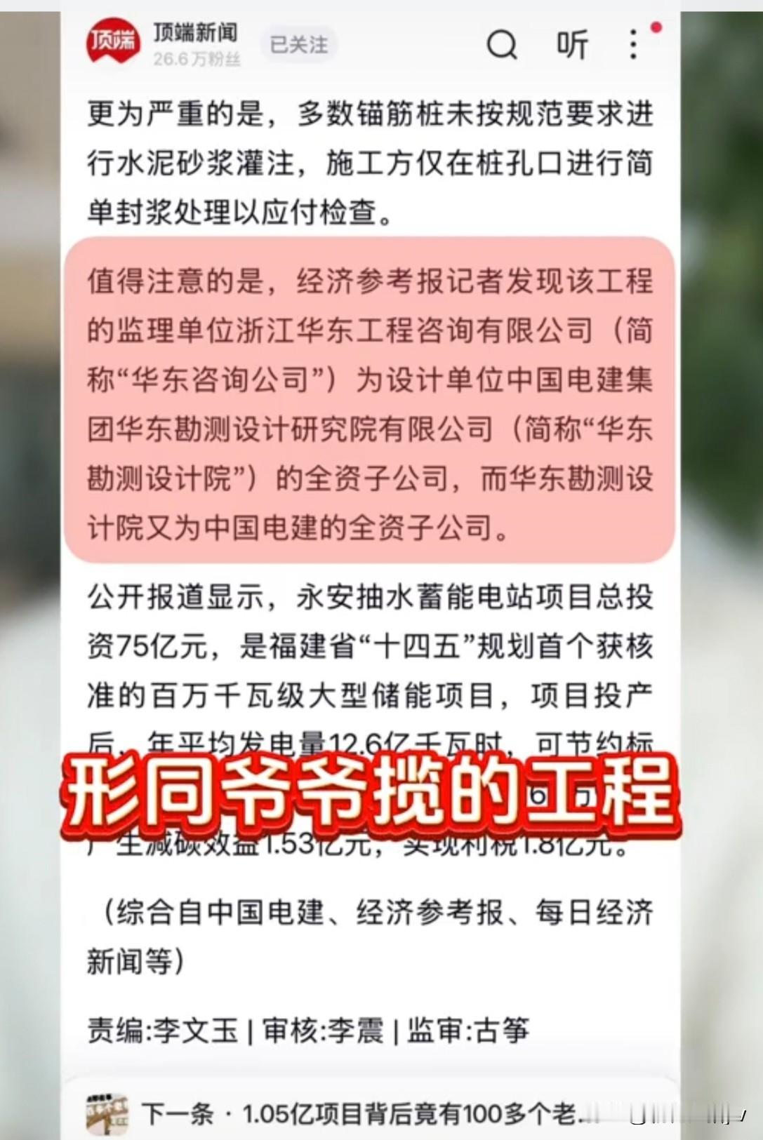 再立新功! 荣膺2025年“敢说敢为奖”的,当属《经济参考》记者。 曝光了中国电建承揽的福建永安在建的下水库工程是“豆 腐 渣工程”! ①注浆不足:一个桩孔要装4袋水泥,现在一袋水泥浇十几个桩孔。 ②桩长缩小:12米的锚筋桩被砍了不足3米。 这可是投资75亿的的民大工程! 国家“十四五”规划中的重 点项目。 都2025年了,国字号企业竟敢明目张胆的偷工减料,建豆 腐 渣工程,这是作死的节奏! 咱们的纪监委同志们该出手了! 别让造福子孙千秋万代的工程泡了汤, “永安”成了一个笑话! 福建大坝调查