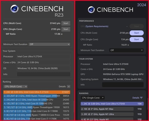 CINEBENCHR23单核得分2195,多核得分37443;CINEBENCH2024单核得分134,多核得分2150,在单核和多核性能方面,酷睿Ultra9275HX释放充分,所以雷蛇灵刃182025虽然设计纤薄,但内吹散热架构加持之下,并不需要在功耗释放和性能层面有所妥协。