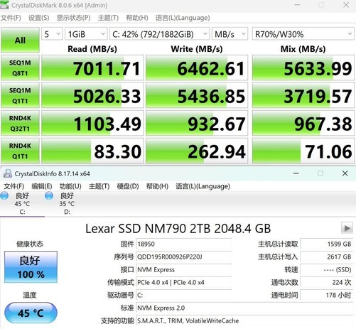 存储方面另外一大亮点,就是配置了4TB的雷克沙NM790PCIe4.0固态硬盘,实测顺序读取速度为7011.71MB/s,顺序写入速度为6462.61MB/s;4K随机读取速度为83.3MB/s,4K随机写入速度为262.94MB/s,可以为系统运行、软件加载、游戏运行提供足够流畅的性能支持。