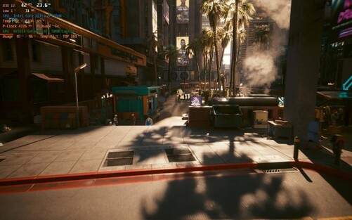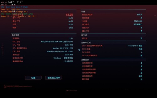 另外一款游戏就是《赛博朋克2077》了,开启超速光追,4K分辨率,未开启多帧生成、但是开启光线重构的情况下,画面平均帧数为61.35fps,而分别开启2X、3X、4X多帧生成的情况下,平均帧数分别达到了131.12fps、184.09fps以及219.76fps,帧数提升显著。而且4K+全局光追的效果充分展现出了《赛博朋克2077》这款游戏绝美的未来科幻场景。