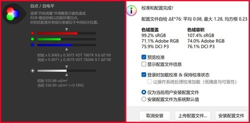 这块屏幕的色准调校也非常出色,平均ΔE值为0.75,最大也只有1.53,色彩偏离度极低,色彩还原精准。