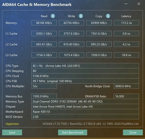 雷蛇灵刃182025顶配版搭载了双通道64GBDDR5内存,基本是一步到位的内存配置。AIDA64内存性能实测读取速度为86186MB/s,写入速度82756MB/s,拷贝速度为83909MB/s,延迟为113.2ns。大内存容量用来做渲染、AI大模型等应用非常合适。
