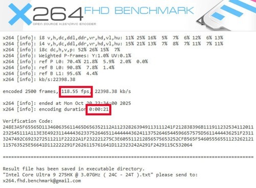 英特尔酷睿处理器在视频编码方面一直以来有着出色表现,H.2642500帧编码帧率达到了118.55fps,完成时间仅为21秒,非常适合做视频剪辑平台。