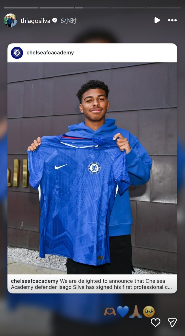 蒂亚戈·席尔瓦17岁的儿子伊萨戈与切尔西签署职业合同,蒂亚戈·席尔瓦社媒转发签约照片,并配上蓝色心形表情符号。