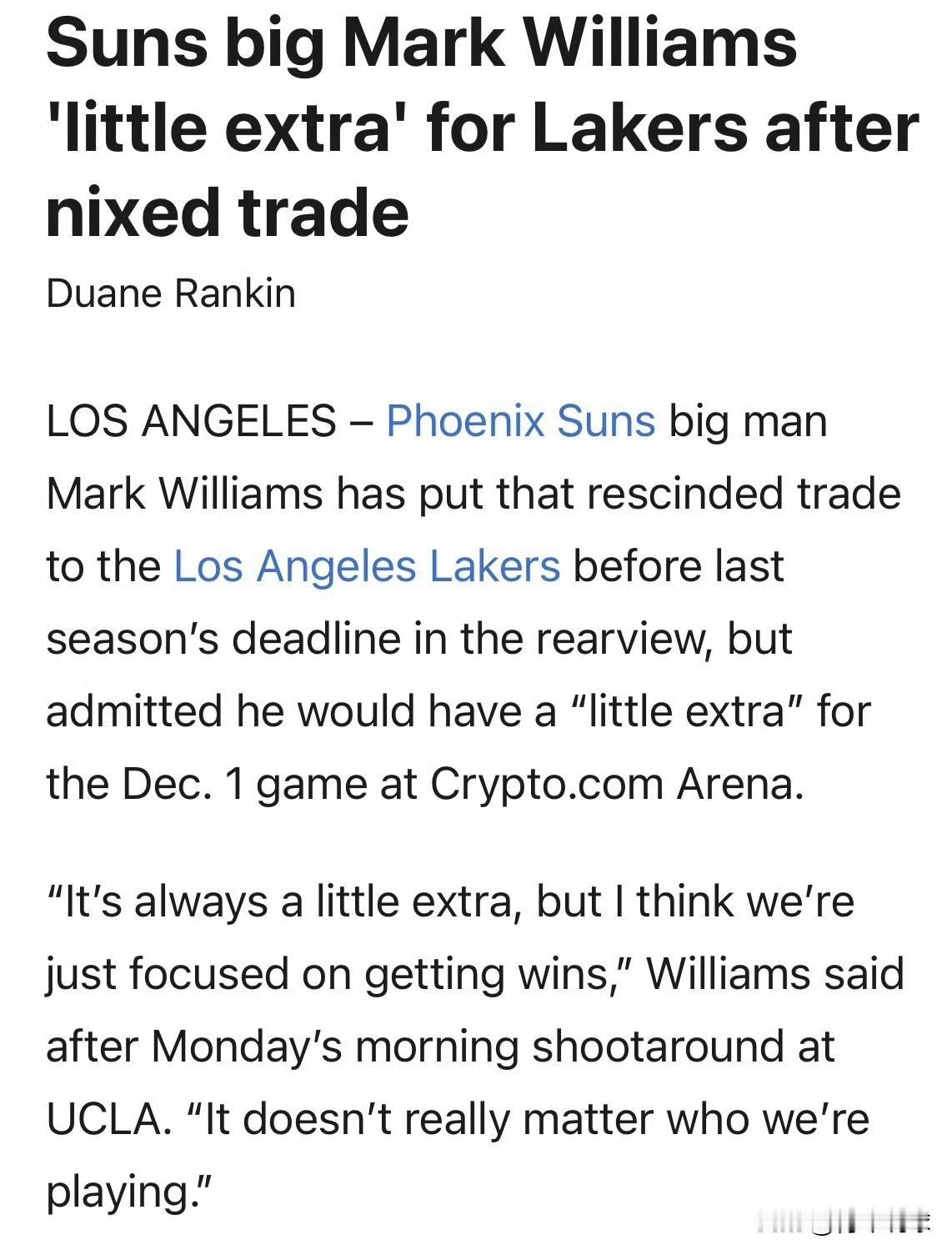 马威还记仇湖人呢! 今天,太阳队将客场挑战背靠背作战的湖人队,中锋马克-威廉姆斯(后面简称马威)迎来复出。赛前,马威接受了媒体采访,谈到了对阵湖人队的态度,他表示自从交易失败后,他都会拿出额外拼劲来对阵湖人队,这次也不会例外。看得出来,马威对上赛季这笔交易依旧耿耿于怀,那他今天与艾顿的对决肯定会非常精彩。 备注:上赛季湖人队曾用克内克特、雷迪什、一个首轮互换、一个2031年首轮从黄蜂队交易得到马威,但因后者体检未通过而告吹。