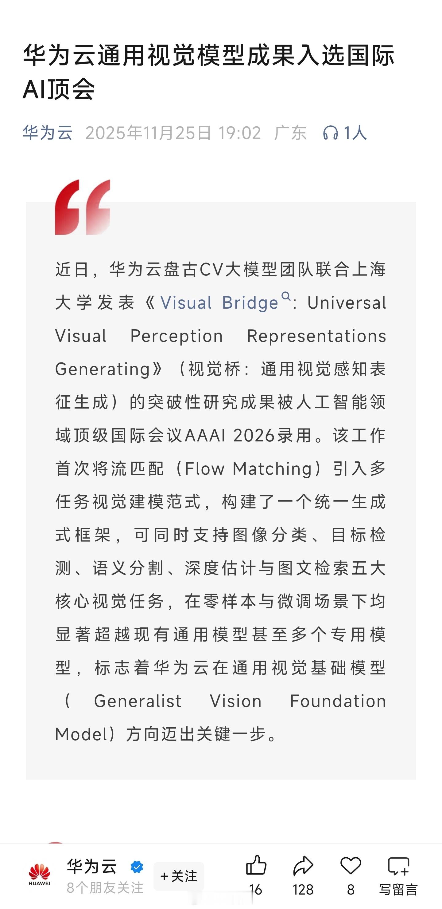 前不久,华为云就有两篇研究成果被AAAI 2026录用。wb上查了一下华为AAAI 2026,居然没有KHL传播,有些不可思议。可能华为也不在意这个荣誉吧,所以没有安排在全网发。对于华为来说,这个荣誉也确实没啥,毕竟首位华人AAAI Fellow和首位华人AAAI主席都是杨强,然后这个杨强是华为诺亚方舟实验室的创始主任。但感到奇怪的是,我查了一圈,居然没发现KHL自发传播,是不是太不懂事了? 难道KHL不提前预判的吗?一旦其它厂商公布AAAI 2026的录用论文后,一群人冲上去骂这个机构水平低,会不会闹出大笑话?