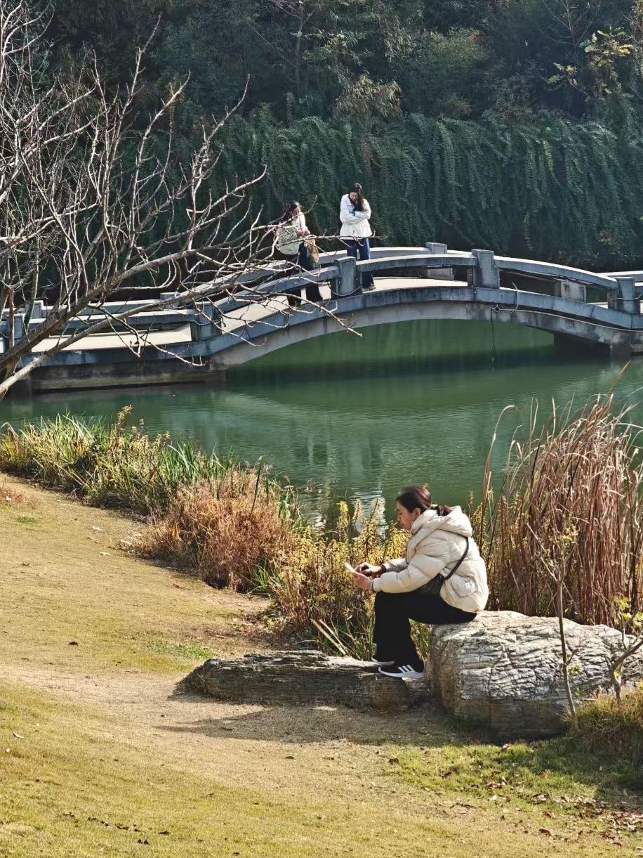 秋光把叶子染成透亮的黄,风裹着暖意往衣领里钻。并肩踩过落满金箔的路,连远处的山影都跟着慢下来——这大概是日子最温柔的模样。 石桥驮着风穿过湖面,苇草把秋意揉进软光里。有人借石当座,把此刻的静,轻拢在掌心的屏幕里——时光慢得,连影子都舍不得走快。