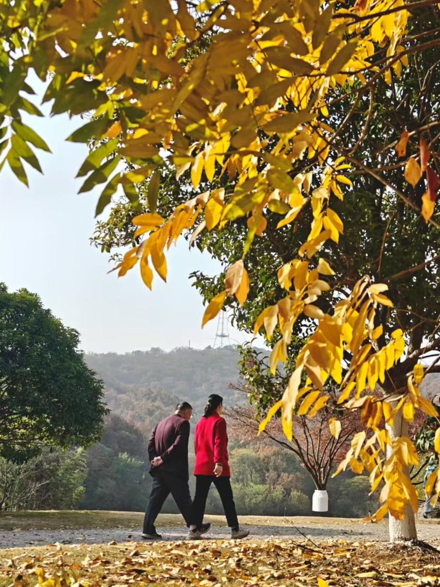 秋光把叶子染成透亮的黄,风裹着暖意往衣领里钻。并肩踩过落满金箔的路,连远处的山影