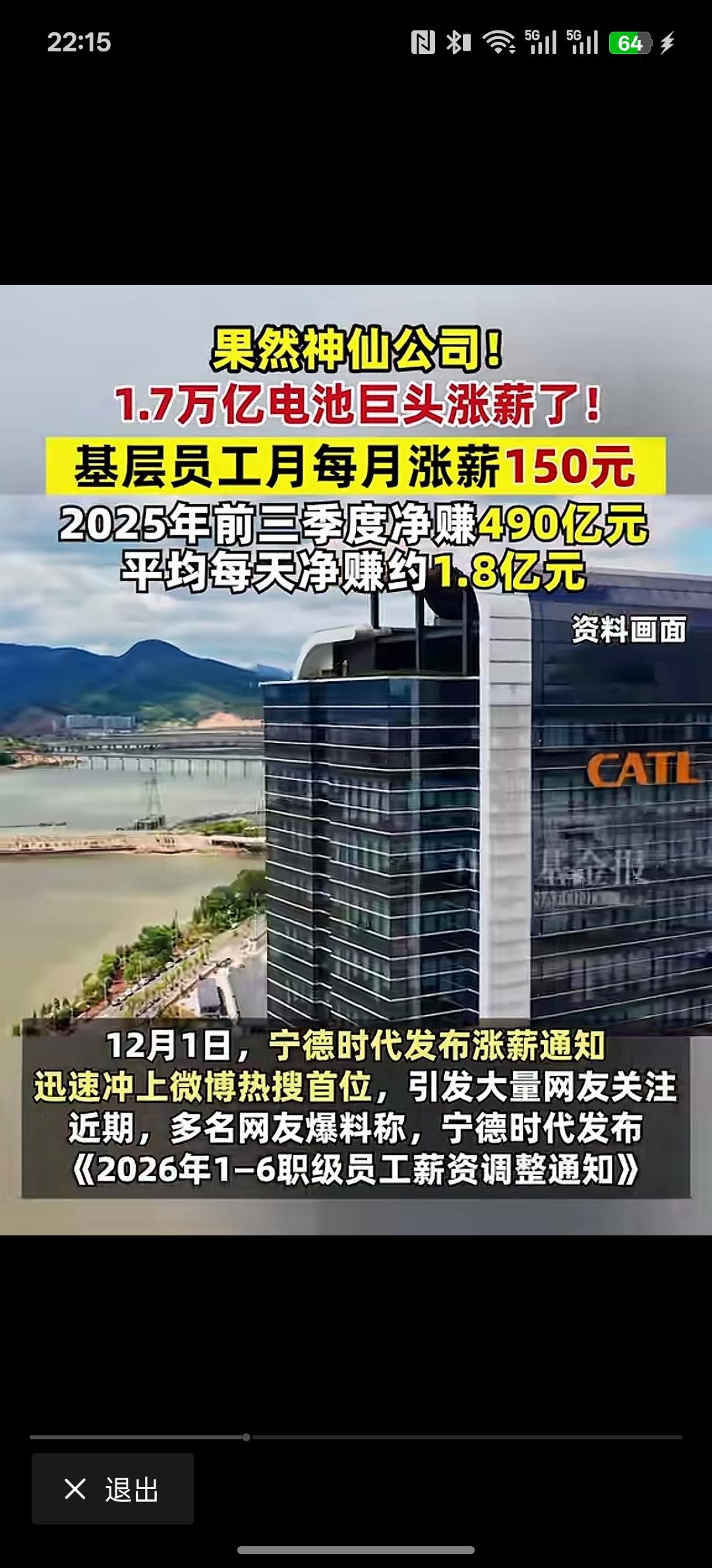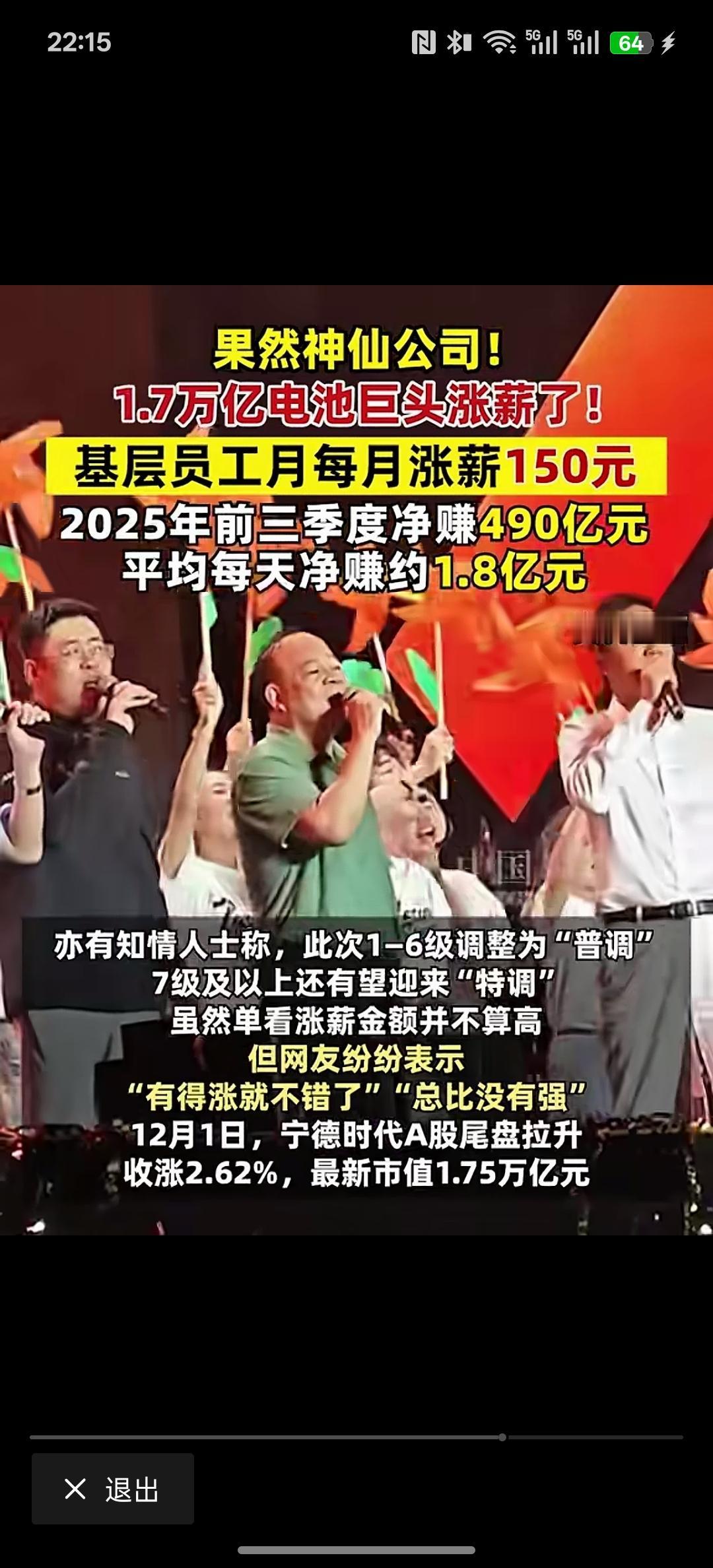 宁德时代确实很赚钱,一个10万的大厂,1到6职级全部员工上调工资150元,所以中国要多创造几家这样的企业福利水平,待遇自然会提高!中国如果有50家这样的企业,害怕中国的消费提升不起来吗?只要老百姓工资上调提升,自然就有消费能力!企业赚钱了,就应该给员工涨工资,有些企业甚至抠抠搜搜的,一毛不拔,十年不涨一次工资!所以怎么能消费得起物价上涨?工资不涨只等着国家硬性要求才涨一点工资,所以这样的企业只能维持员工的基本生计!却无法让居民财富有增收!