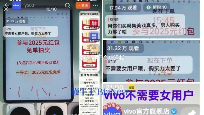 近日,vivo官方直播间在直播过程中突现大量与产品无关的评论,评论量达平日的8.9倍。期间,个别含有“不需要女用户”“女性购买力差”等性别歧视意味的言论被置顶,迅速引发网友强烈不满和舆论关注。