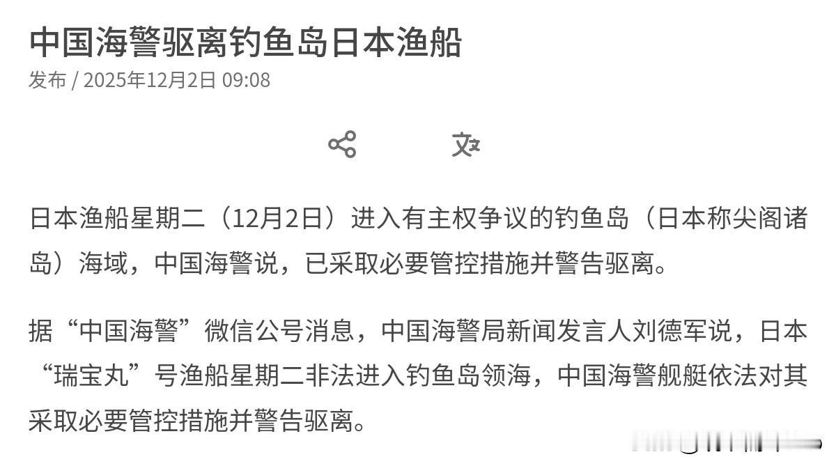 有实际动作了!中国海警船对日本渔船进行驱离,我们对钓鱼岛的主权正在走向彻底的实控!12月2日,根据外媒报道,外媒称,中国海警对进入钓鱼岛海域的日本渔船实施了驱离。中国海警局新闻发言人刘德军说,日本“瑞宝丸”号渔船星期二非法进入钓鱼岛领海,中国海警舰艇依法对其采取必要管控措施并警告驱离。 我方坚定的表示,钓鱼岛及其附属岛屿是中国固有领土,中国敦促日方立即停止在该海域的一切侵权挑衅活动。很显然,在当下,日本渔船进入钓鱼岛海域,这就是对我们在进行试探。但事实证明,我们的立场是绝不允许日本渔船在我方海域捕鱼,这样的驱离就是在以强硬的手段,表明我方立场。 事实上,在中日关系急剧恶化之际,有外媒就表示,中国极有可能采取实控钓鱼岛来反制高市早苗。从目前情况来看,我们显然已经在打算这样做了。而接下来就看日本如何回应?如果不出预料,日本下一步可能是派海警船前往钓鱼岛进行挑衅,但是估计我们也绝不会惯着。 日本媒体事实上也已经注意到,我们派往钓鱼岛的海警船都配备了机炮,我们显然为可能的局势升级做好了准备。现在高市早苗无疑面临着极大的压力,如果其妄图升级紧张局势,我们定会强力反制,不排除我们会让军舰搭配海警船在钓鱼岛巡航,并进行相关登岛活动。显然,高市早苗现在是骑虎难下。