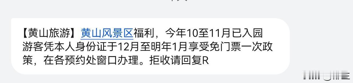 免费爬黄山。 今年的11月份去爬了一次黄山,回到家不久,就收到黄山风景区那边发来的福利,说今年10至11月已入园游客凭本人身份证,12月份或者到明年1月份这两个月,再爬黄山,可以不用门票可以直接进入黄山景区。 这个政策对于近黄山的人还好,像我们远的,如果单单只是想去爬黄山,专门去跑一趟,那还是算了,来回机票都上千了,加上住宿吃饭还要买黄山的大巴车票,缆车票等,你不要190元的黄山风景区门票,但是却要花得更多。黄山风景区很好,但是对于我们去过一次了,就算免门票,也不会再去了。