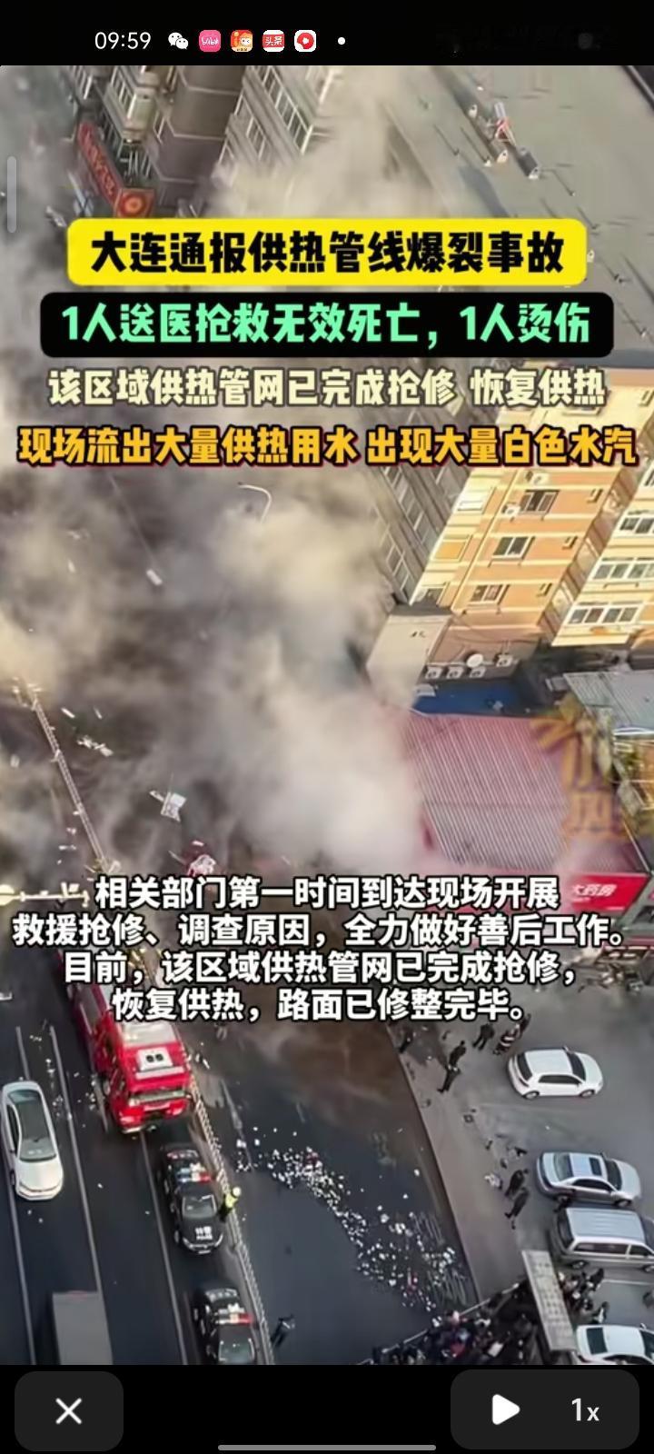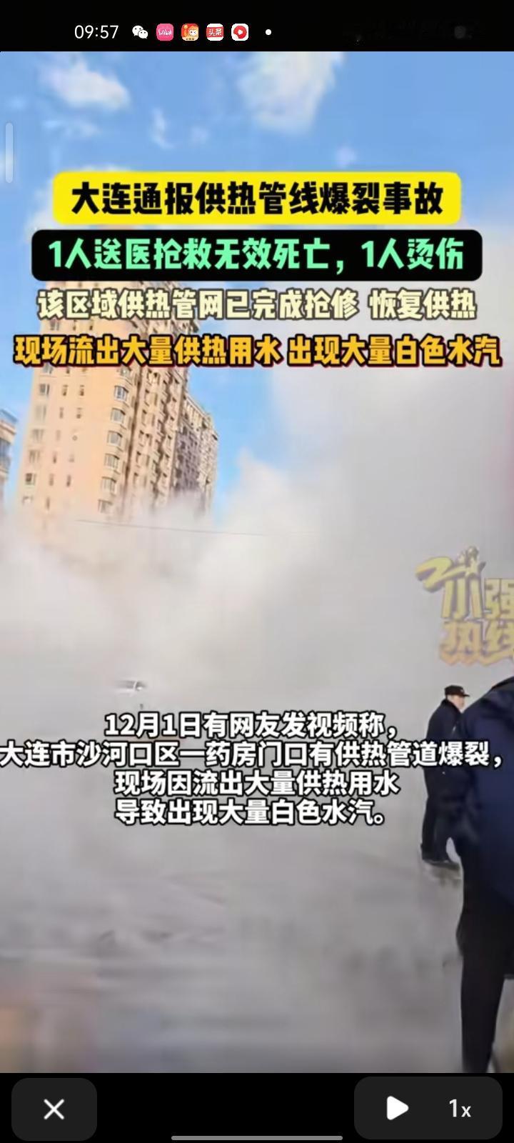 12月1日,辽宁大连。网友晒视频称,大连市沙河口区一药店门口有供水管道爆裂,现场流出大量供热用水,导致出现大量白色水汽。沙河口区住建局发布了情况通报,事故造成一人抢救无效死亡,一人烫伤,相关部门第一时间到达现场开展救援抢修、调查原因,全力做好善后工作。目前,该区域供热管网已恢复供热,路面修改完毕。 一次看似普通的管道爆裂,却带走了一条鲜活的生命,也给城市的安全管理敲响了警钟。供暖季里,千家万户的温暖背后,是无数管线和设施在默默运行。希望这次事故的调查结果能尽快公布,责任得到严肃追究,同时推动相关部门对全市供热和供水管网进行一次彻底的“体检”。唯有把隐患消灭在萌芽状态,才能让市民的冬天既有温度,也有安全感。