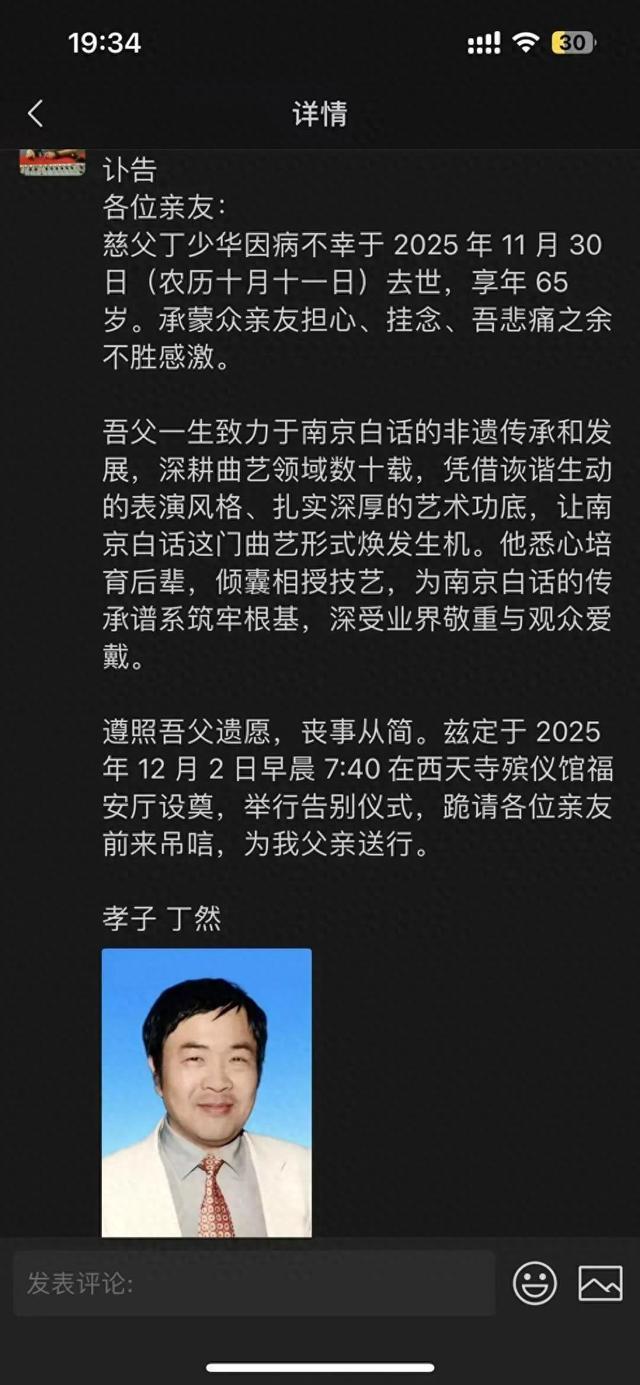 在讣告中,丁然沉痛地表示:“父亲一生致力于南京白话的非遗传承和发展,深耕曲艺领域数十载,凭借诙谐生动的表演风格、扎实深厚的艺术功底,让南京白话这门曲艺形式焕发生机。他悉心培育后辈,倾囊相授技艺,为南京白话的传承谱系筑牢根基,深受业界敬重与观众爱戴。遵照吾父遗愿,丧事从简。兹定于2025年12月2日早晨7:40在西天寺殡仪馆福安厅设奠,举行告别仪式。”