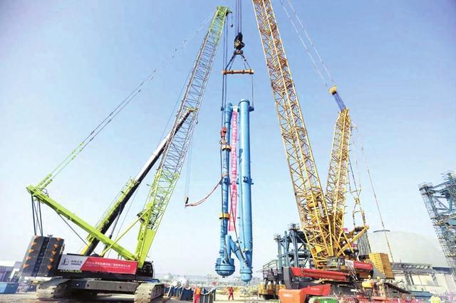 12月1日,湖南石化生物质气化柔性平台建设项目大件设备流化床气化炉吊装场景。