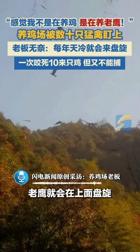 “防不胜防!”近日,浙江杭州,一男子在山上养鸡,可是降温后,有大量老鹰迁徙过来,每天就在鸡场上空盘旋,只要人不注意,就会飞下来抓鸡吃!男子尝试养狗驱赶,但是没有用,放鞭炮又怕起火,真是没招了。网友:鹰的天敌是什么? 随着气温逐渐降低,大量候鸟踏上了迁徙之路,有的鸟甚至要跨越大半个地球,才能找到合适的栖息地,这一路上不知道会遇到什么麻烦,可浙江的一名男子,却因为鸟类迁徙而忧虑起来。 原来,飞来的鸟类不是别的,而是凶猛的老鹰! 据媒体12月2日的报道,男子在山上养了大约300只鸡,眼瞅着就要过年了,正是卖鸡的好时候,可是天上最近一直有老鹰盘旋,时不时的就抓几只鸡吃,损失越来越大。 男子也不是没有想办法,养了几条狗在鸡场附近,可是老鹰根本不怕它们,放鞭炮倒是管用,但是又怕把树林点着,自己只能每天在附近巡逻,一看到有老鹰飞过来就驱赶走。 但是男子也有不在的时候,这时候老鹰就瞅准时机开始狩猎,等他回来时已经吃饱离开了。 为此,男子向网友们寻求帮助,希望能在不伤害老鹰的前提下,成功将它们给赶走。 有网友建议:可以在地上摆上几个音响,不断发出声响来吓老鹰,就是不知道对鸡有没有影响。 信息来源:《12月1日(采访时间),浙江杭州,“感觉我不是在养鸡是在养老鹰!”养鸡场被数十只猛禽盯上,老板无奈:“每年只要天气冷了,老鹰就会在上面盘旋,多的时候一次给咬死十来只。”》闪电新闻