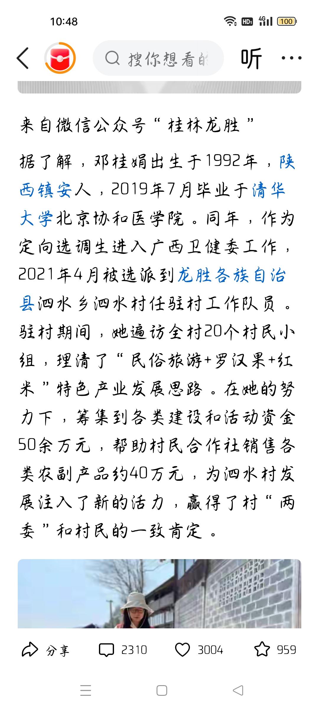 33岁驻村女干部去世,系清华硕士,我想说 据极目新闻报道,33岁原驻村干部邓桂娟因病去世,她是驻村女干部,还是清华硕士,她是选调生,为什么引起关注呢?因为她在驻村工作期间,理清了“民俗旅游+罗汉果+红米"特色产业发展思路,在她的努力下,筹集资金50余万元,销售了农副产品约40万元,改善了当地村民的生活水平,为当地的发展注入了活力,为当地经济发展作出了贡献,得到了村民和村党支部的肯定。个人认为,她为村民干了实事,所以当地党组织才会记得她,才会发公众号宣传她。各位条友觉得呢?