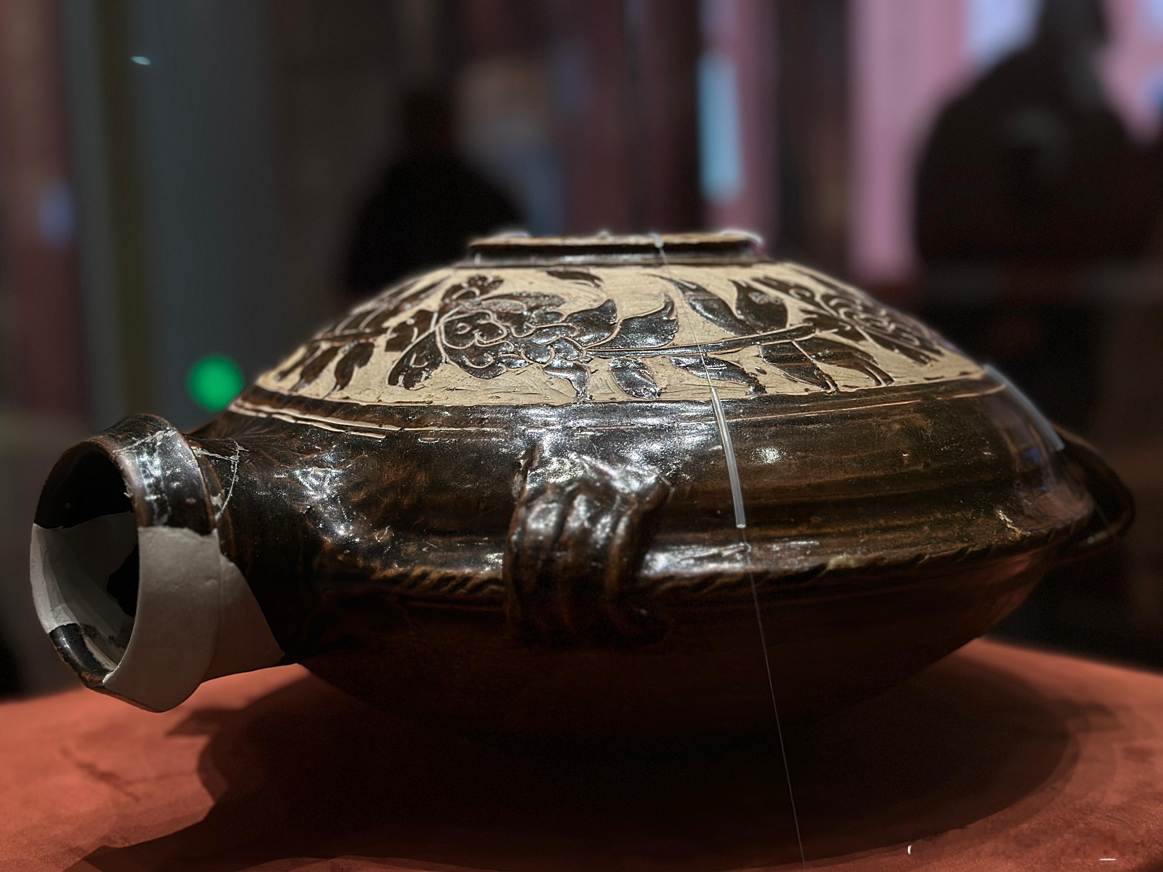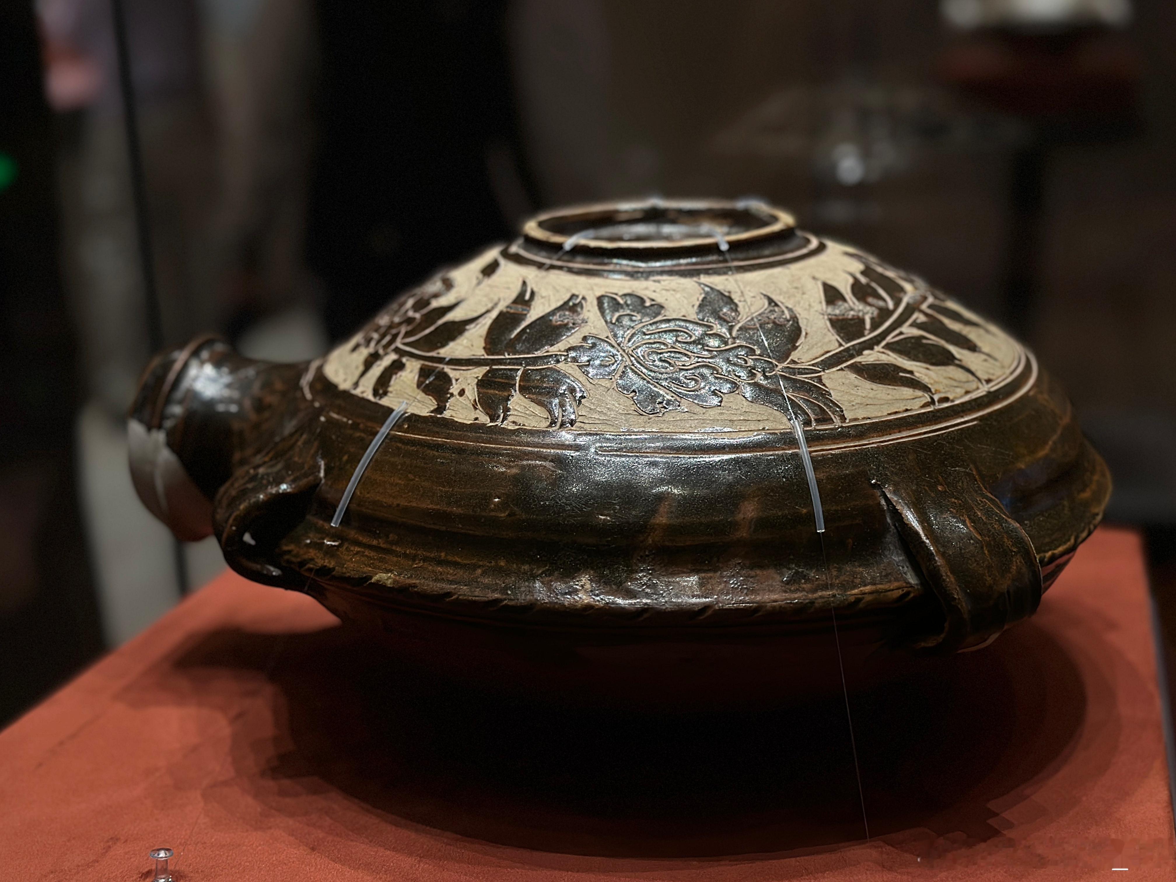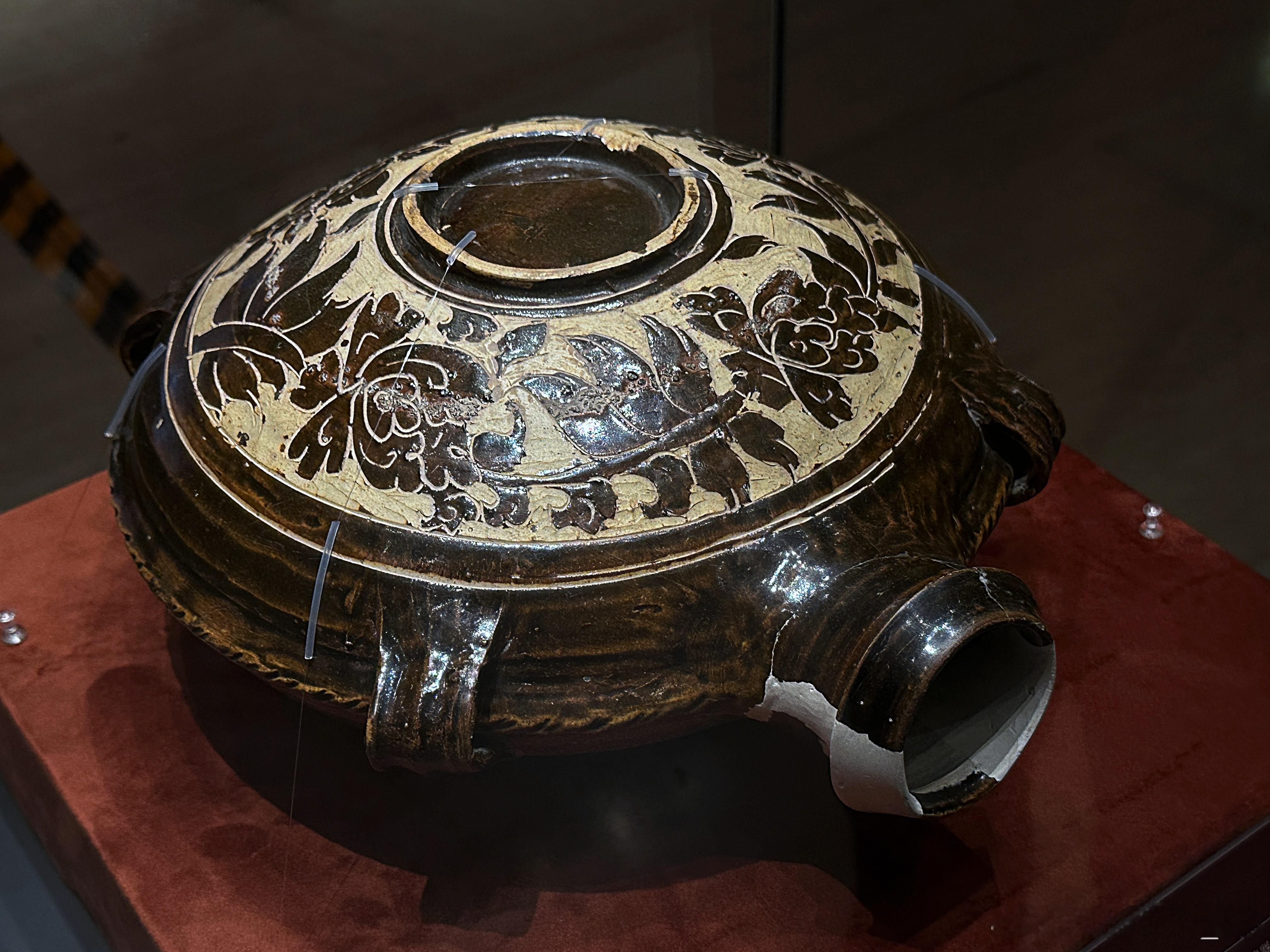贺兰山下“桃花石” 西夏文物精品展 褐釉剔刻花四系扁壶/西夏海原县博物馆藏扁壶是西夏瓷器中比较常见的器物,也是最具民族特色的器物,制作精美,产量较大。扁壶的两侧有双耳或四耳,以便穿绳提拿或携带,其造型可能从游牧民族盛水的皮囊壶演变而来。扁壶腹部的圈足起放置平稳的作用。党项人长期生活于马背之上,而扁壶体态轻盈,形状非常适合在马背或驼背上携带,是党项人所喜爱的生活器皿。摄于首都博物馆2025.10.29