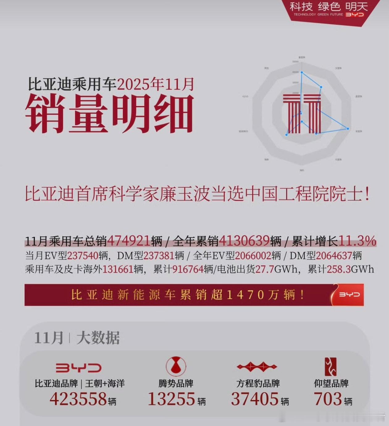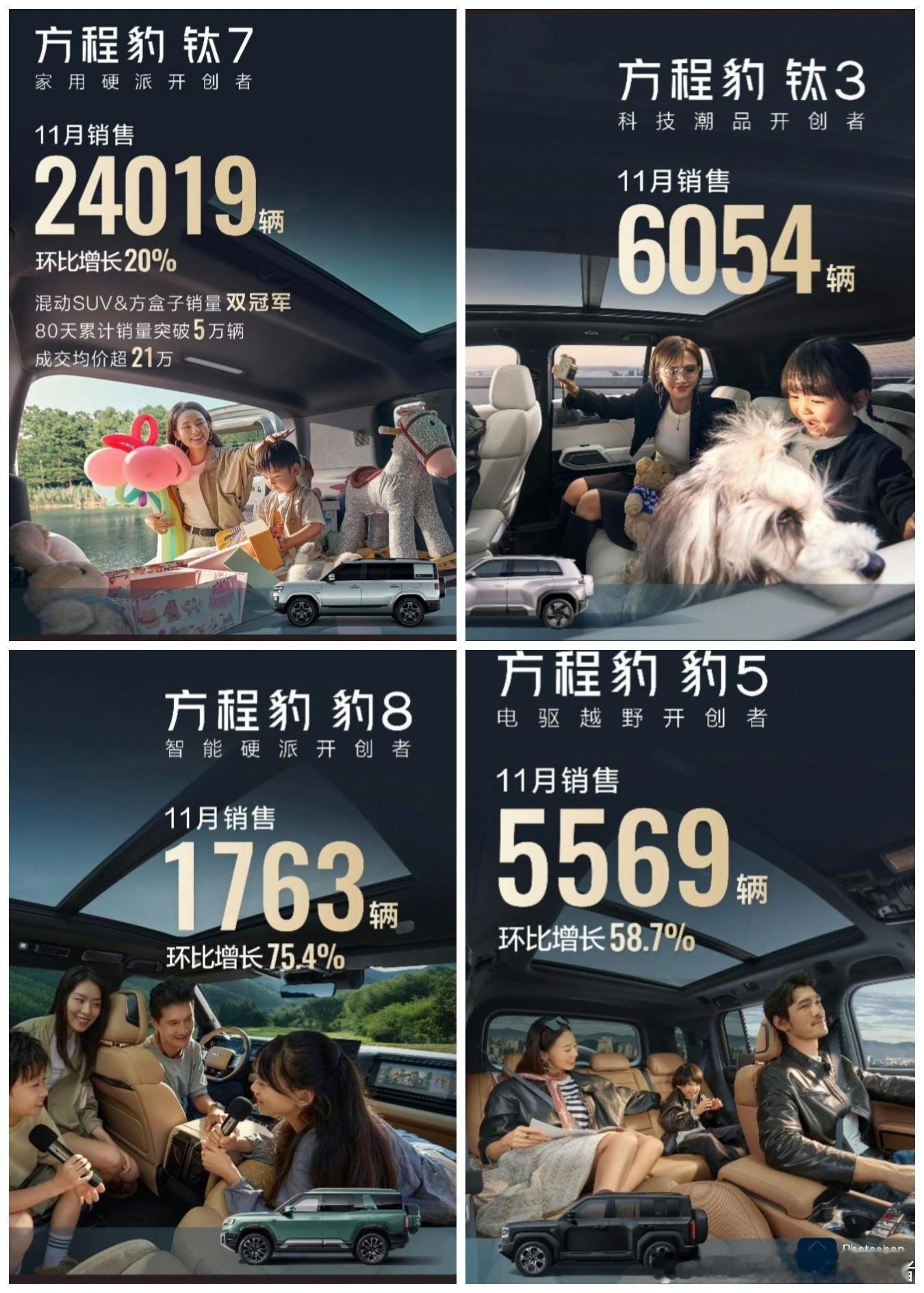 比亚迪11月细分销量出炉,海洋网表现出色,方程豹销量均衡。从小迪快报的数据来看,11月比亚迪王朝网共销售184338辆新车。其中,比亚迪夏卖了3889辆,宋家族卖了33926辆,秦家族卖了70824辆,汉家族卖了14612辆,唐家族卖了13252辆,元家族卖了47835辆。该说不说,秦家族真的猛啊,加推后的长续航版目前效果不错。海洋网整体表现比王朝网更好,11月销售233431辆新车。海鸥销量超过5万,海豚销量超过3万,海豹系列销量接近6.1万。海狮系列接近5.5万,驱逐舰05和宋Plus系列还有1.4万和2.2万的销量。海洋网销量超过王朝网,主要是产品和设计更年轻化,爆款也多。腾势品牌这边,腾势D9销量为5707辆,这款车面临改款换代了。N9还有1580辆,腾势N8L销量5443辆,其他车型中规中矩了,需要明年改款上新。方程豹品牌这边布局比较均匀,方程豹钛7销量24019辆,这车是真正的爆款,热度极高。方程豹钛3在11月也有6054辆的好成绩,方程豹豹5也有5569辆,豹8也有1763辆,整体可圈可点。仰望,主要是靠着仰望U8和仰望U8L,两款车卖了526辆,仰望U7为176辆。这样看来,仰望品牌还得卖一百多万以上才行啊。
