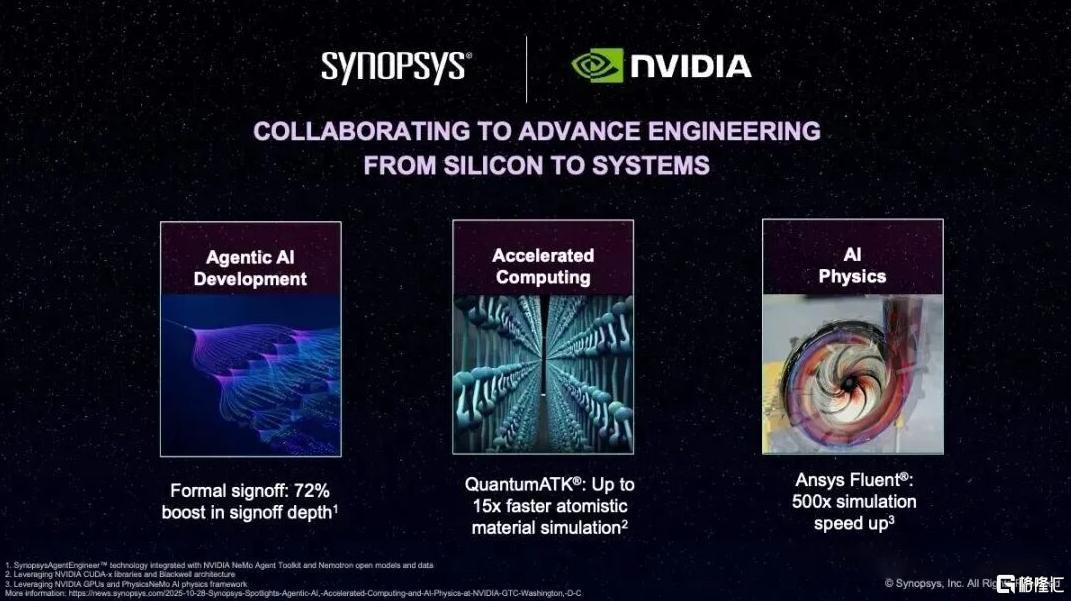使用英伟达CUDA-X库和AI物理技术,新思科技将进一步加速和优化其广泛的计算密集型应用组合,涵盖芯片设计、物理验证、分子模拟、电磁分析、光学仿真等。