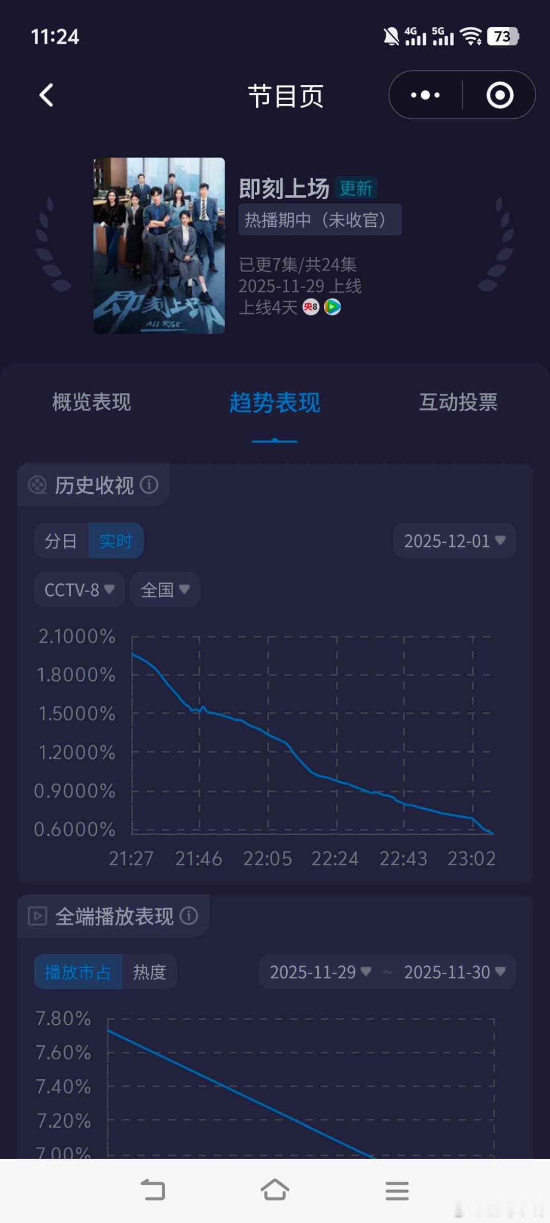 看个剧被00后点了《即刻上场》这收视率太惨了!昨晚接新高的《大生意人》收视率反而降了好多!双集平均从1.3降到1.15!单天走势播完已降到0.6以下!看看图三隐锋,同样接的大生意人,单天播完还能保持在1.1。