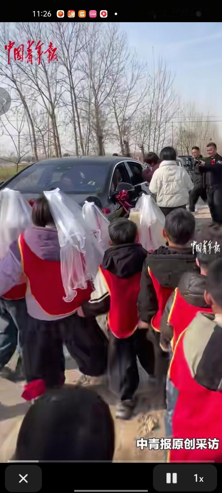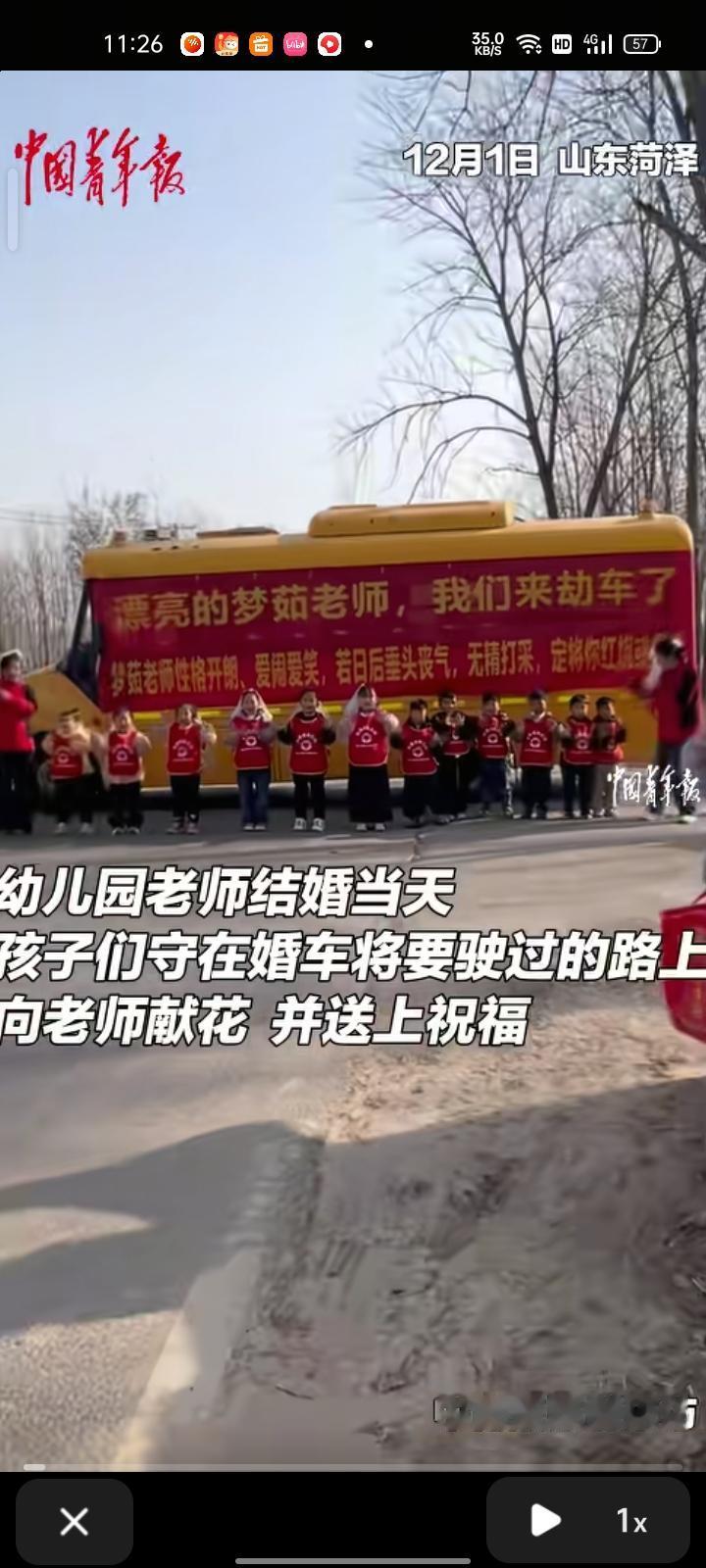 12月1日,菏泽市曹县。幼儿园老师结婚当天,孩子们守在婚车将要驶过的路上,向老师送花并送上祝福。 婚车负责人李先生称,当时是新娘家回新郎家,画面特别温暖,他们的老师感动到落泪了。每个孩子给老师说“祝老师新婚快乐”,孩子们很激动也很开心