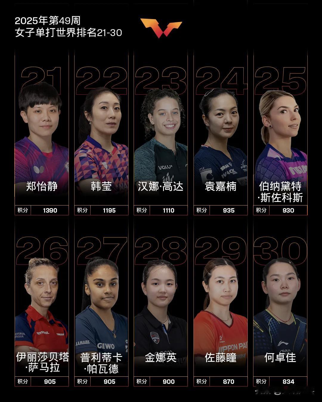 2025年第49周世界排名 【来源:ITTF 2025.12.2 星期二】 男子单打,中国队球员王楚钦、林诗栋位列前二,梁靖崑位列第七。 汤姆·贾维斯排名上升11个名次位列第61,刷新个人职业生涯排名新高。 其他中国队球员,向鹏排名第11,陈垣宇排名第24,周启豪排名第41,陈俊菘排名第45,黄友政排名第49。 女子单打,中国队球员孙颖莎、王曼昱、陈幸同、蒯曼、王艺迪位列前五,陈熠位列第九。 金成珍排名上升26个名次位列第73,刷新个人职业生涯排名新高。 其他中国队球员,石洵瑶排名第13,何卓佳排名第30,覃予萱排名第33,钱天一排名第37。