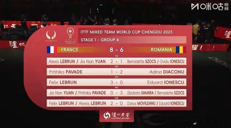 乒乓球成都混团世界杯小组赛收官轮一场生死战,法国队与罗马尼亚队经过五场14局的激战,最终法国队8-6险胜,位列两连胜的德国队之后,排名小组第二晋级八强。本场比赛法国队女将表现不佳,在女单、女双、混双丢了6分,好在这次勒布伦兄弟没掉链子,前两轮都输球的小勒布伦3-0击败爱德华·约内斯库,哥俩儿又在双方前四场战成6平后,在决定胜负的最后一场男双2-0取胜,帮助队伍涉险过关。