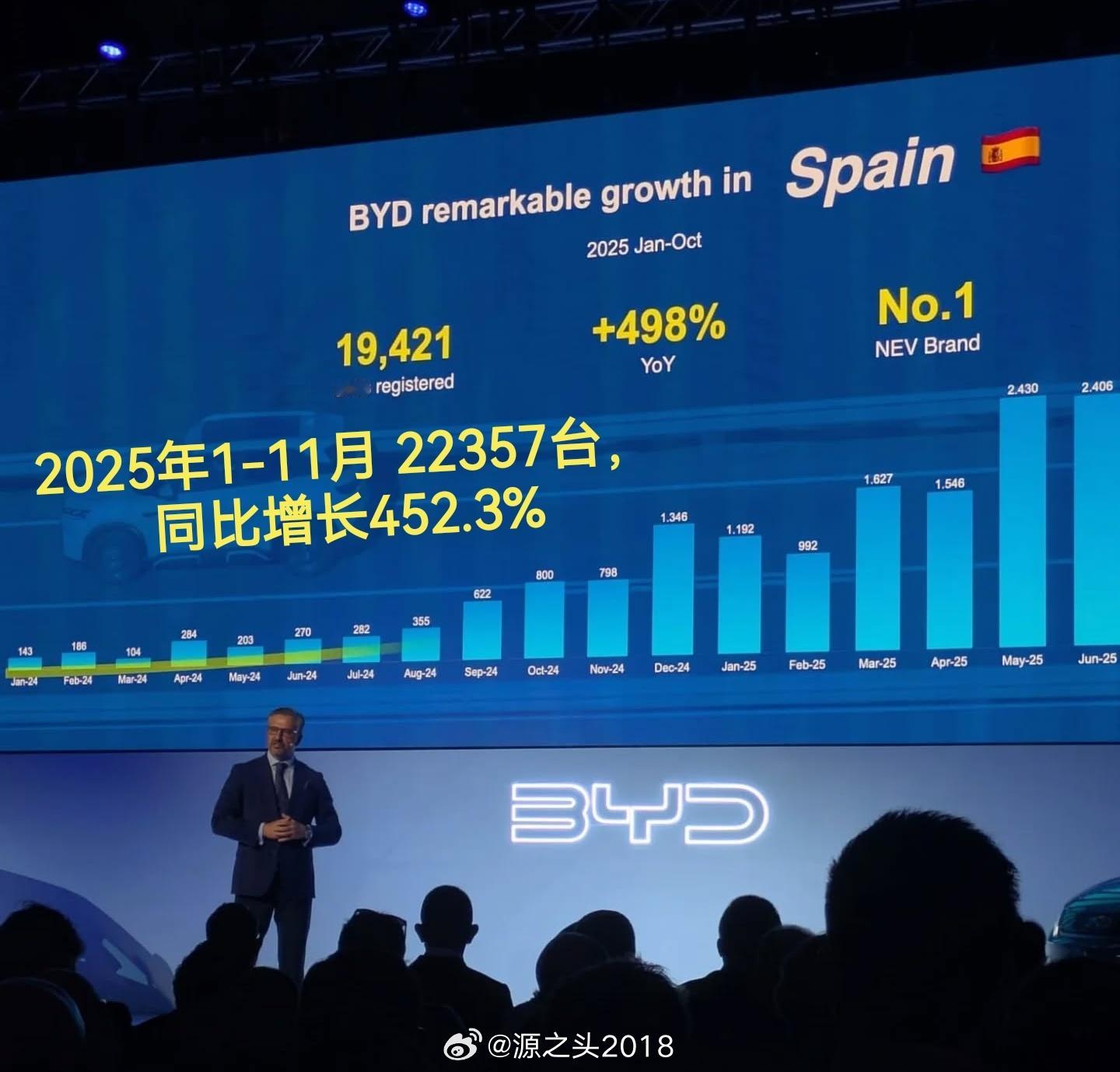 比亚迪 西班牙|11月销量/交付2934台,再创历史新高◆ 纯电1994台,纯电市场No.1◆ 插混940台,插混市场No.11-11月,累计销量22357台,同比增长452.3%;其中纯电13963台,插混8394台。11月,腾势Z9GT交付一辆(展车/试驾车?)。2025年底看点:◆ 年度销量基本板上钉钉破25000◆ 年度纯电销量能否超特斯拉夺冠?(1-11月,特斯拉销量14211台,比亚迪纯电销量13963台)