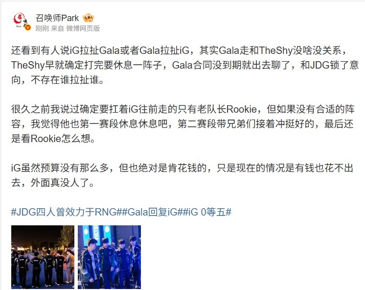 还看到有人说iG拉扯Gala或者Gala拉扯iG,其实Gala走和TheShy没啥没关系,TheShy早就确定打完要休息一阵子,Gala合同没到期就出去聊了,和JDG锁了意向,不存在谁拉扯谁。