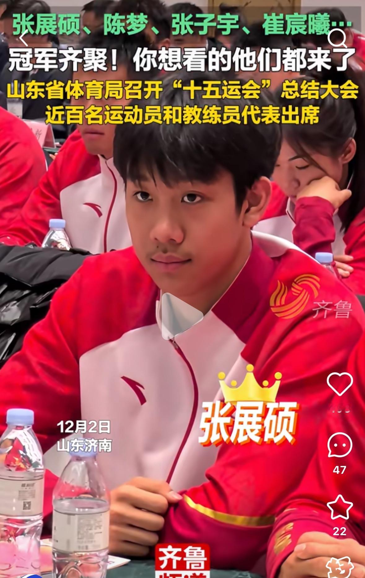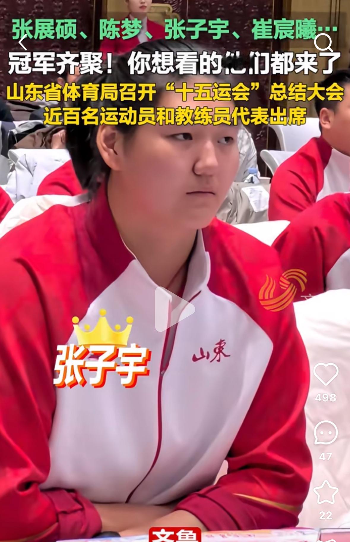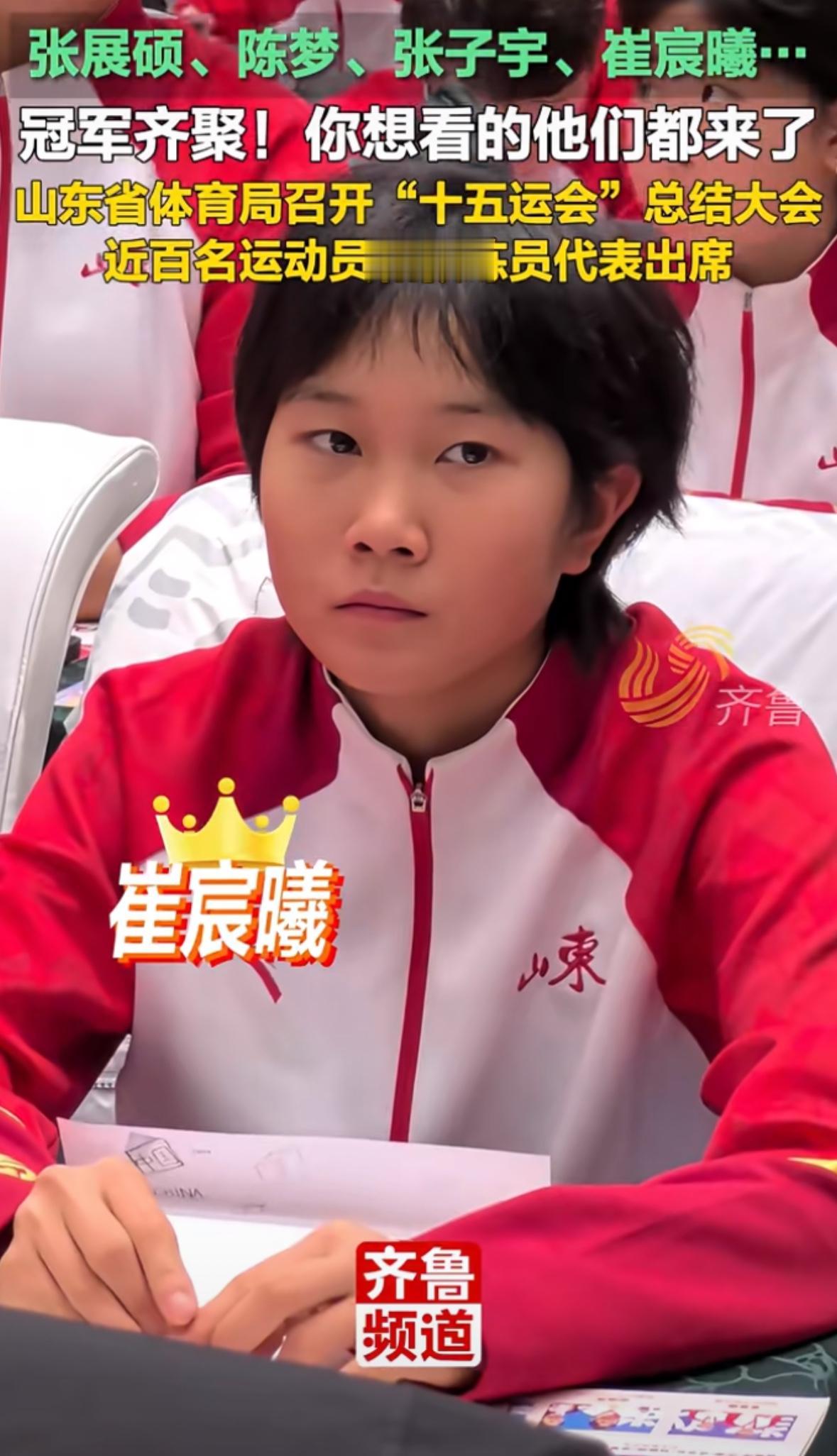 陈梦 张展硕 崔宸曦等冠军齐聚—参加山东省第十五届全运会总结大会 近百名运动员和教练人员参加, 陈梦在大会上讲话, 要用自己的力量和行动 培养下一代小球员, 用自己的拼搏精神鼓舞他们 为了心中的梦想, 再坚强一点, 再坚持✊一下, 成绩永远不会骗人, 不会辜负你留下的汗水! 陈梦目前的乒乓球学校办的很好, 这次乒乓球女队姜依依 获得青年组女单银牌, 女团银牌🥈, 就是陈梦乒乓球学校🏫的!