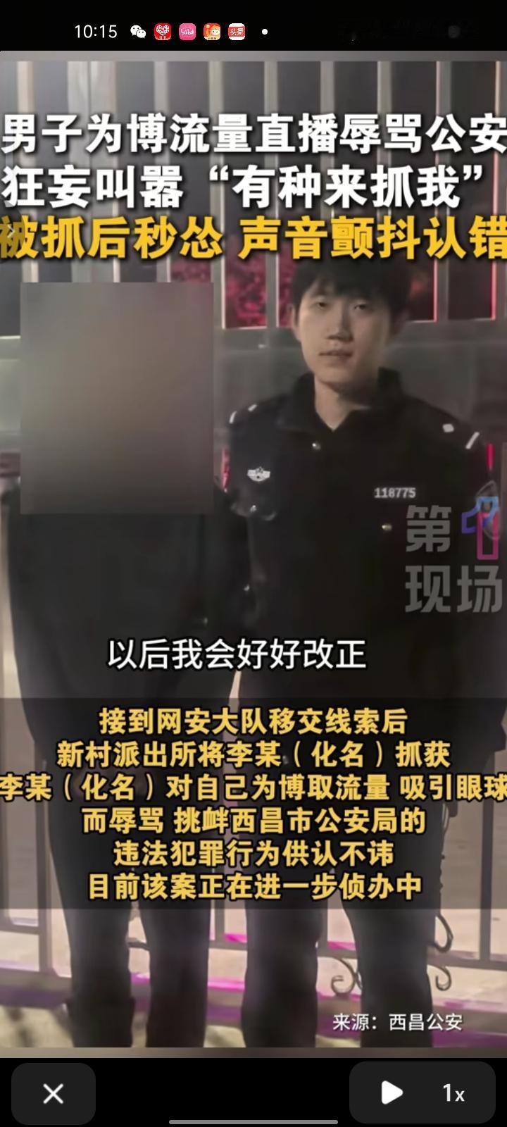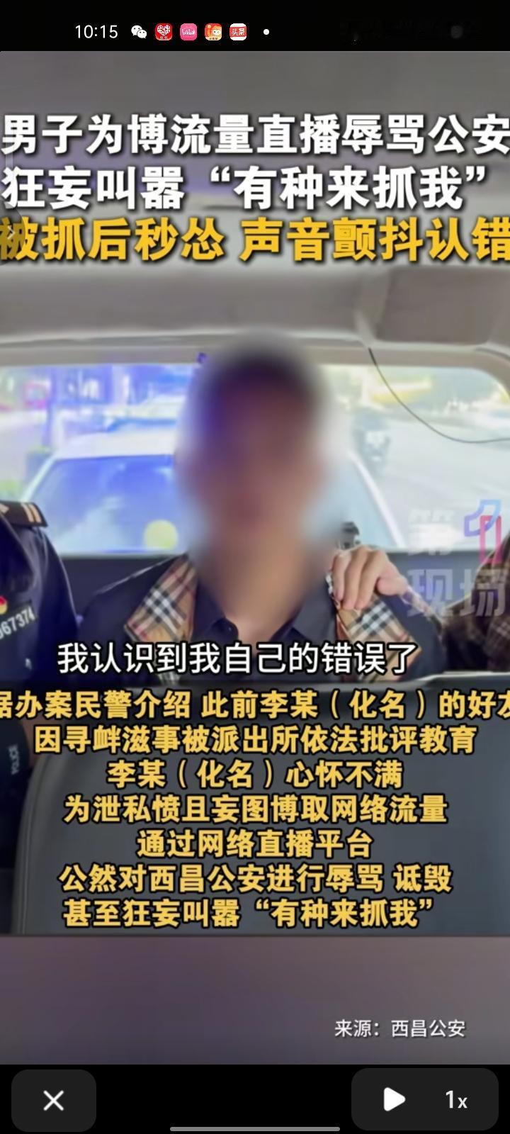 12月1日,凉山州西昌市。李某在直播中肆意辱骂民警,嚣张叫板公安机关,被警方依法抓获 办案民警介绍,此前李某的好友因寻衅滋事被派出所依法批评教育,李某心怀不满,为泄私愤且妄图博流量,在网络平台直播公然对西昌公安辱骂、诋毁,甚至叫嚣“有本事抓我”。 接到网安大队移交线索后,新村派出所将李某抓获,李某对自己的行为供认不讳,认识到自己的错误,该案正在进一步侦办中。 直播不是法外之地,网络更不是情绪的垃圾桶。对公安辱骂和挑衅,不仅是对法律尊严的践踏,还会受到网友们的谴责 在法治社会,每个人要为自己的言行负责,与其靠“博眼球”走捷径,不如用理性和尊重赢得真正的关注。