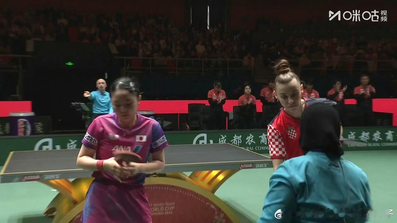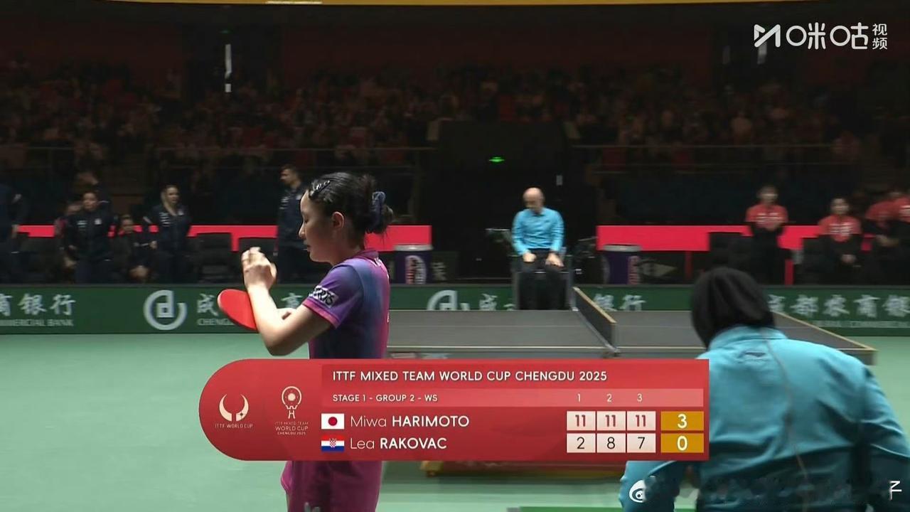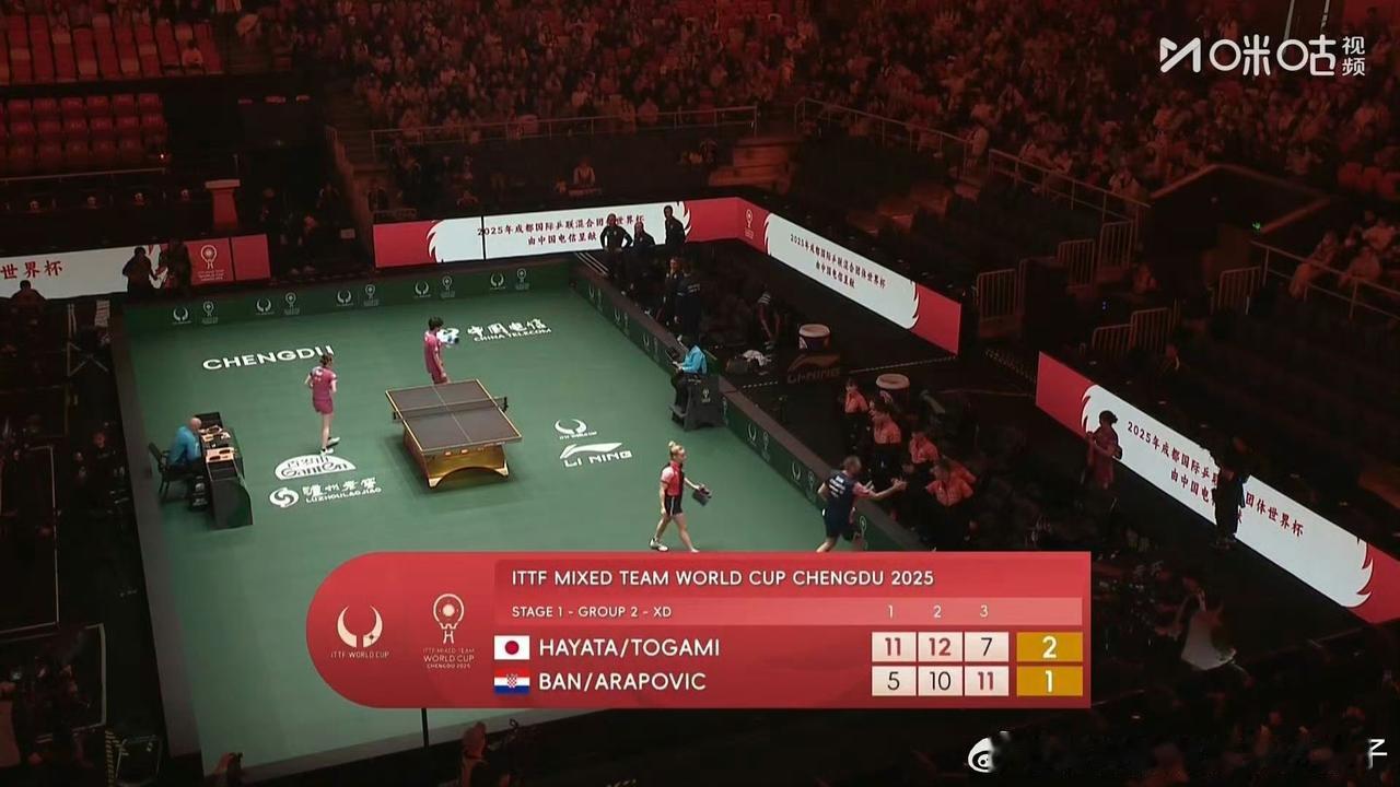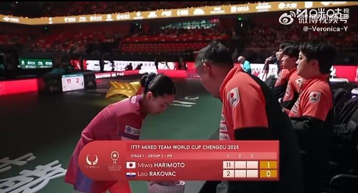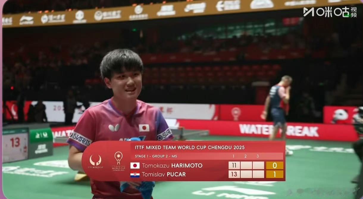 第三盘第一局张本智和输了[捂脸], 对手是克罗地亚选手普卡🇭🇷, 这是2025成都国际乒联混团世界杯小组赛,日本队对阵克罗地亚队的比赛。 第一盘混双比赛,户上隼辅/早田希娜2-1领先伊沃·本/阿拉波维奇, 第二盘女单比赛,张本美和3-0领先莉娅·拉科瓦奇, 第三盘男单比赛,第一局张本智和11-13输给了普卡[捂脸], 目前大比分日本队5-2领先克罗地亚队。 日本队的一名场外指导是张本兄妹的父亲张本宇。