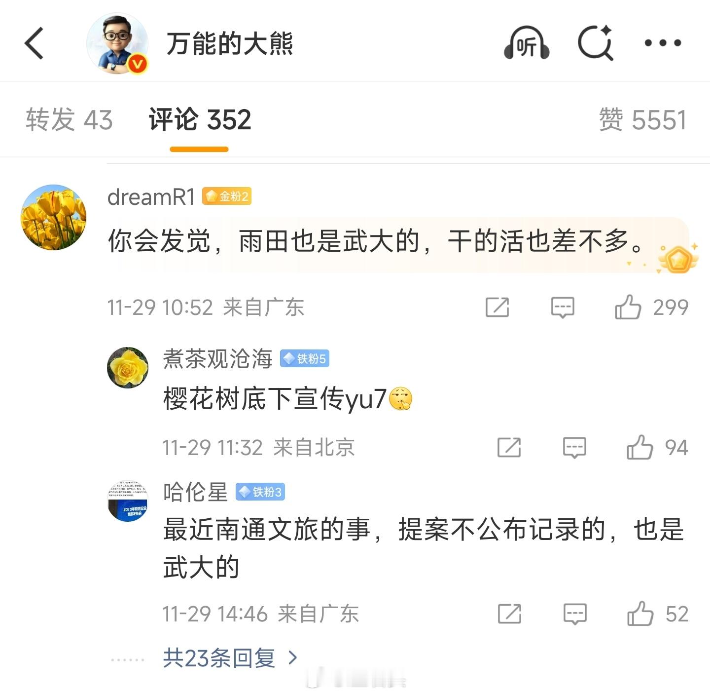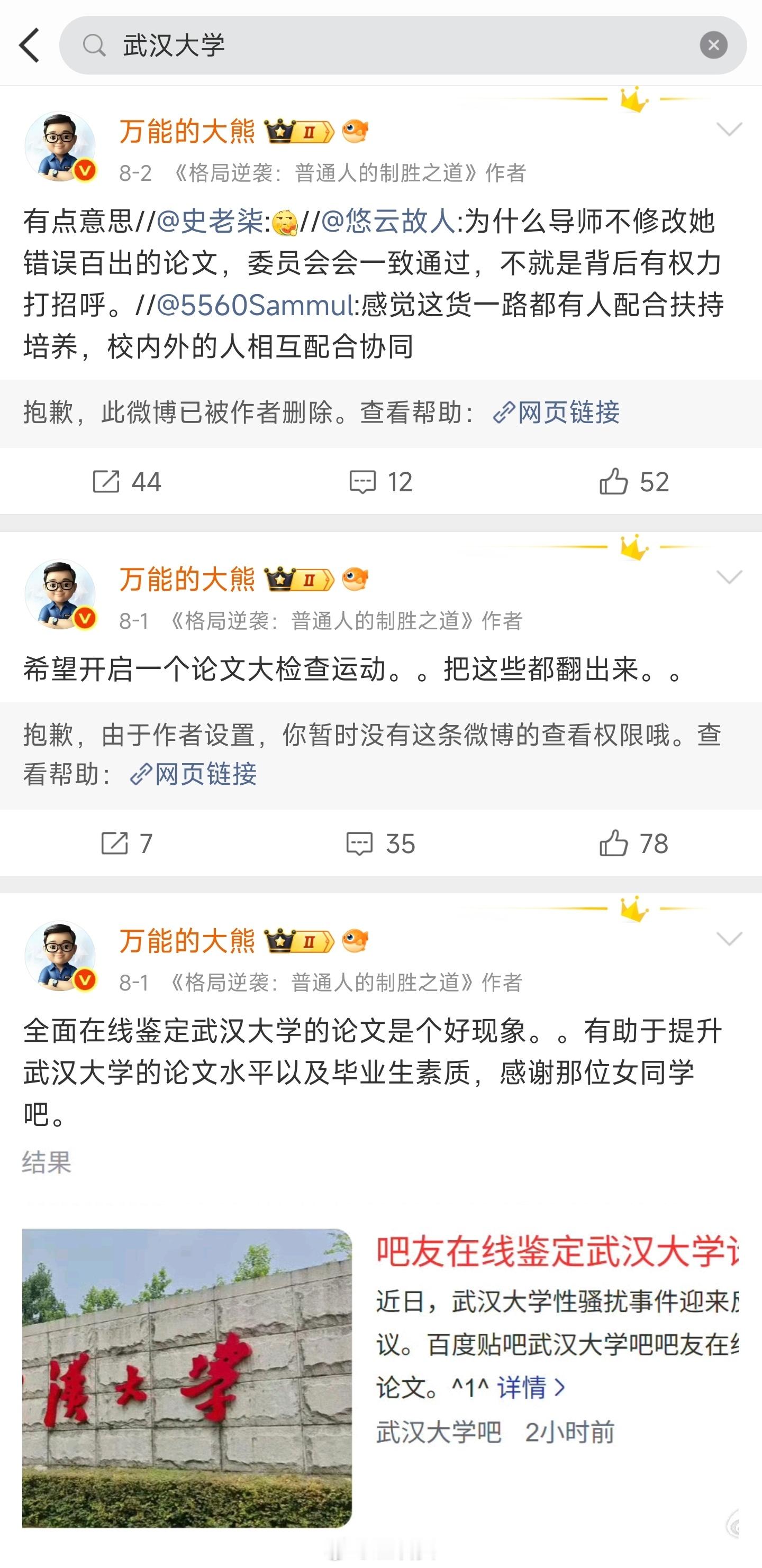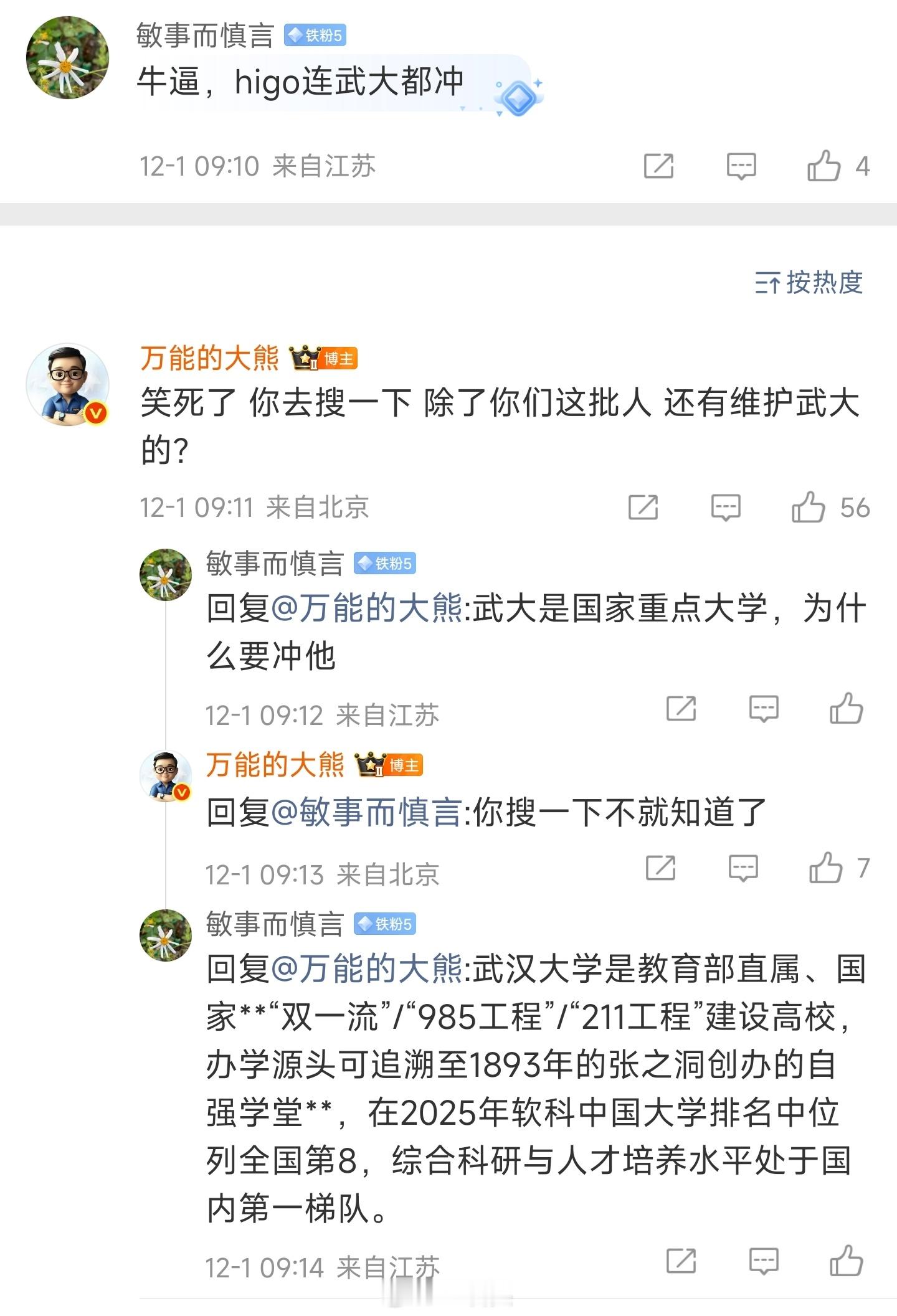 突然发现熊老师最近冲武汉大学冲得挺起劲的,包括7月底的那波女拳,熊老师都冲在一线。其它时候的社会事件没见熊老师这么卖力,翻了翻评论区,猛地发现了熊老师的真实目的。武汉大学好歹也是国内高校前20,冲高校仅仅只是因为一个人。