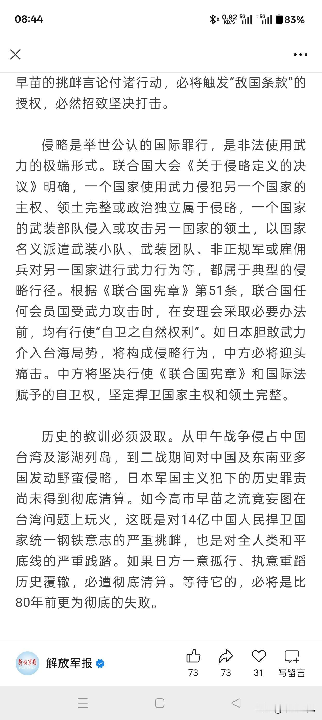 我国再次致函🇺🇳,该函将作为联合国大会正式文件,向全体会员国散发! 小本子,现在每天占用了我们很多官媒新闻的版面,这就足以看出来我们的决心和力度了,这场新时代抗日斗争,注定抗日持久,在舆论战线上,我们要保持高强度的宣示! 小本子,现在非但没有撤回言论,反而,持续挑衅变本加厉,居然还想向菲猴子出口导弹,野心昭然若揭,军国主义复活之势,愈加明显了,但是,也注定失败,彻底覆灭! 最新消息,小本子渔船居然闯入我国钓鱼岛领海,我海警编队坚决管制驱离,下一次,直接喊话几次后,再不走,直接开火警告射击就行了, 不然,它们太蹬鼻子上脸了,有些国家,不吃软的,只有硬的才能让它们认识到问题的严重性! 大家觉得呢?评论区说说你的看法!中国联合国