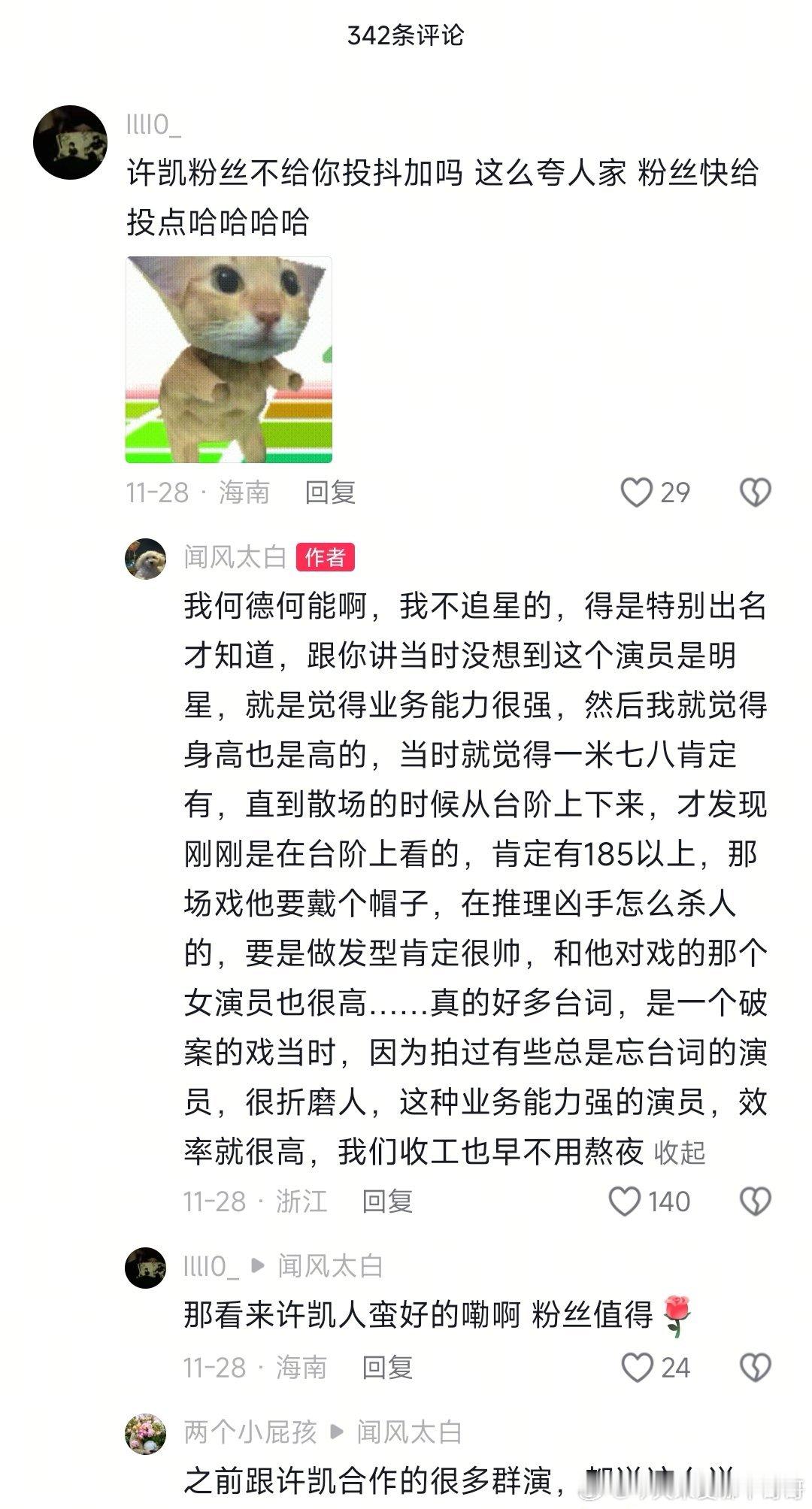 群演口中的许凯 许凯被天都异闻录群演夸了,拍夜戏高效率,业务能力很强,私下没有