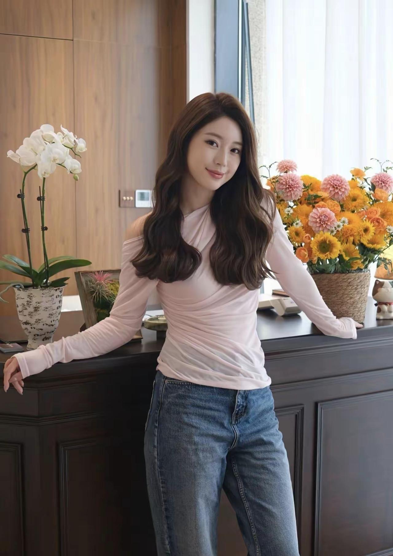 波浪卷,牛仔裤,粉嫩上衣,浅笑盈盈 喝白酒,抽雪茄,夹脚拖鞋,舍我其谁 牛仔波浪
