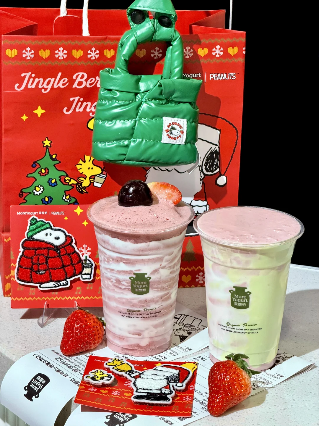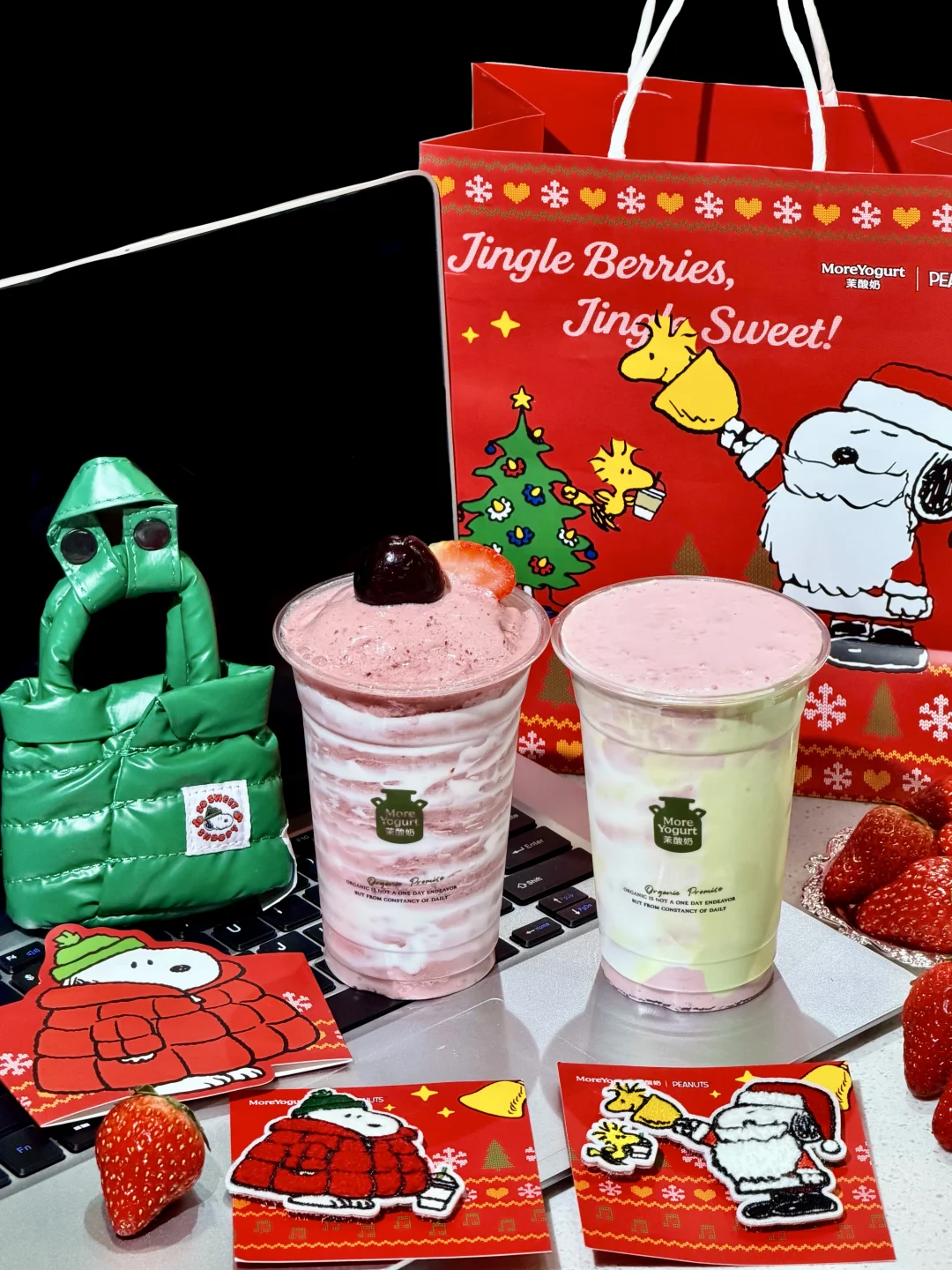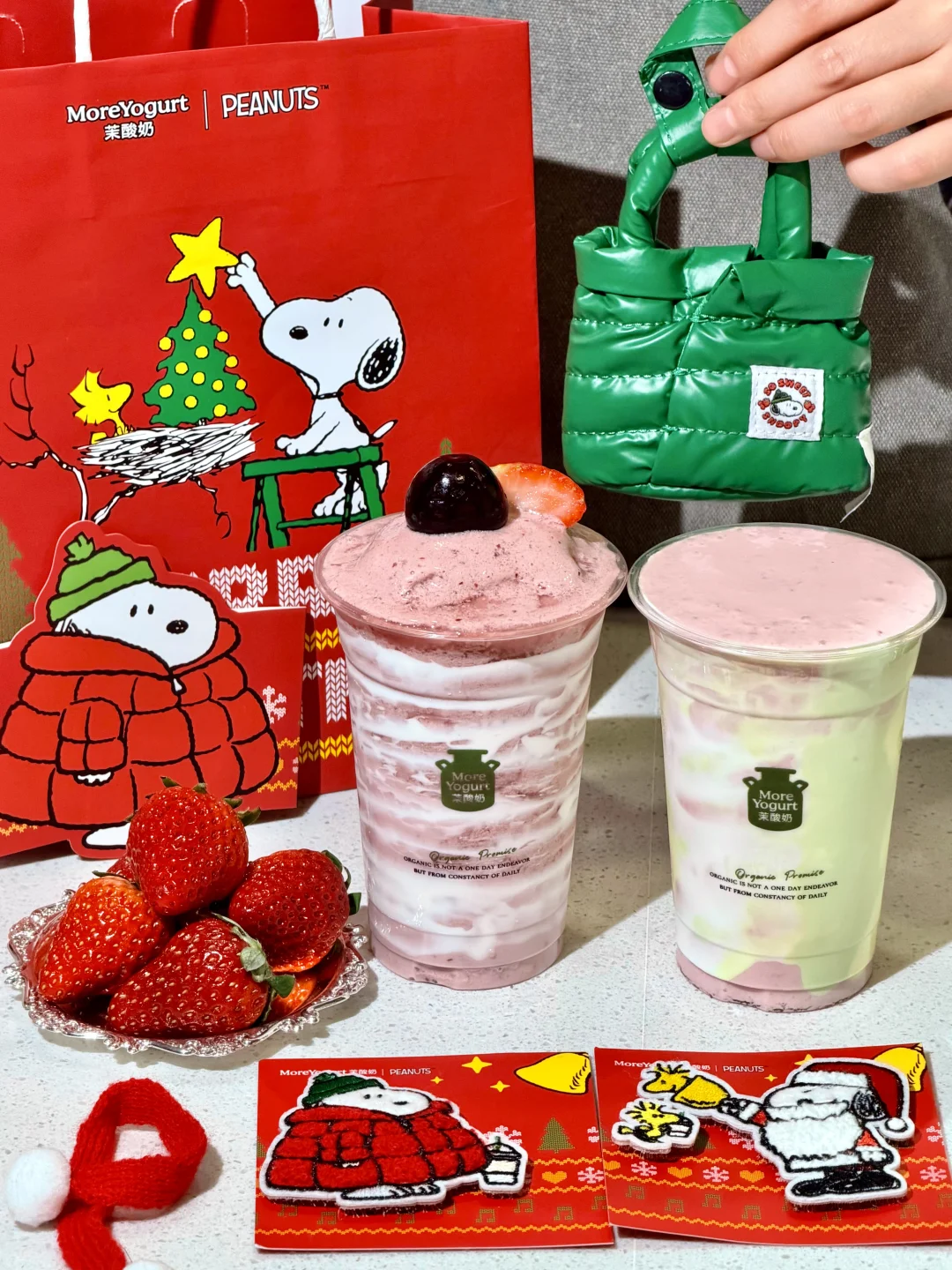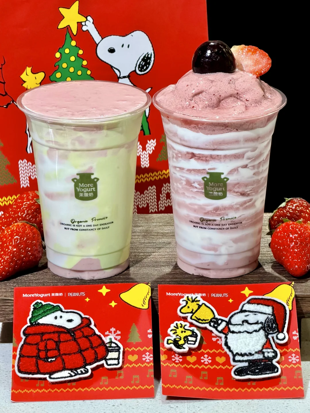 快来和茉酸奶✖️史努比一起过圣诞🎄! 圣诞氛围拉满了!!周边也好好看 联名史努比耳机包好可爱,冬天耳机也需要保暖羽绒服嘿嘿,挂在包包上巨吸睛~ 圣诞毛毡魔术贴也超实用!贴毛衣、贴包包都很不错,还可以贴刘海,可爱到爆~ 🍓草莓车厘子双旋酸奶奶昔 醇厚酸奶裹着车厘子和草莓的果香!顶部还有新鲜车厘子和草莓,酸酸甜甜的,果香浓郁超清爽~好好喝!! 🍓双莓绮梦酸奶 丝滑到像抿云朵!车厘子和草莓的清甜裹着奶香,细腻不厚重,每一口都好治愈~