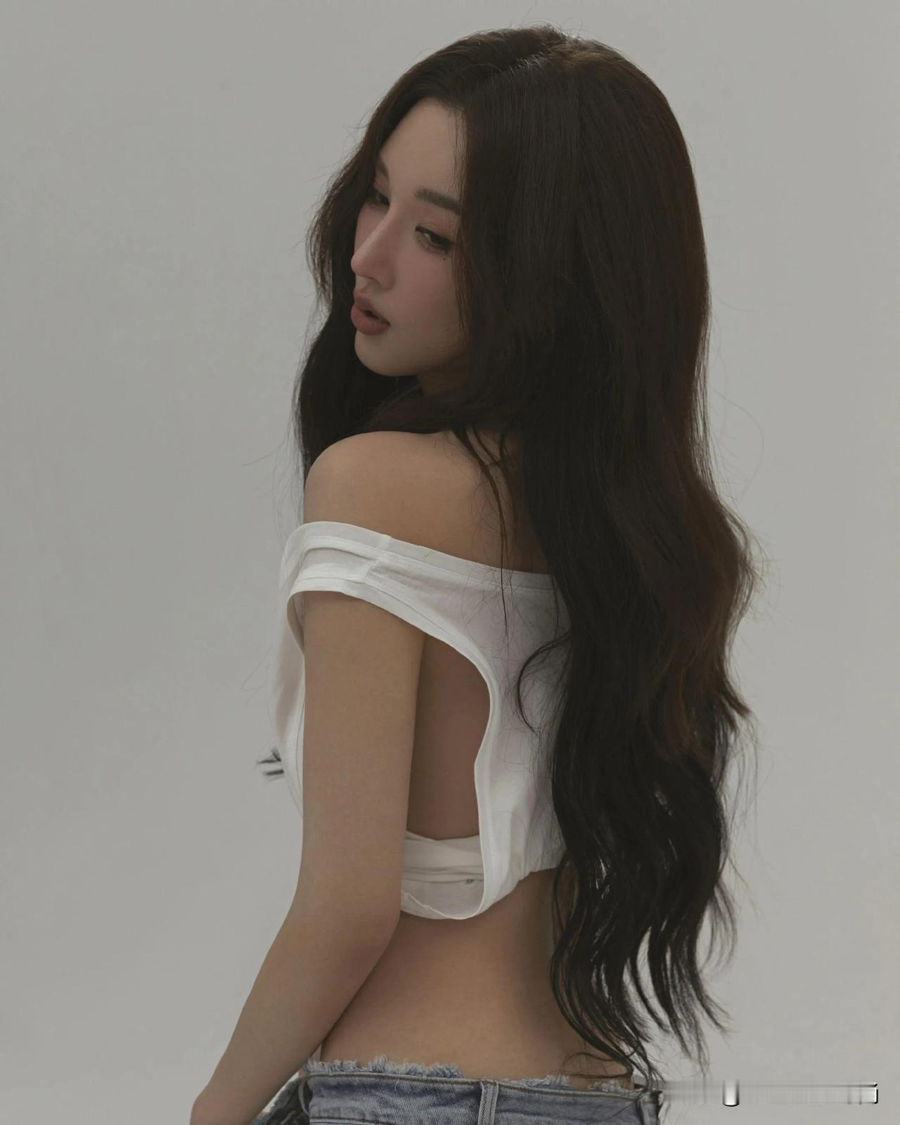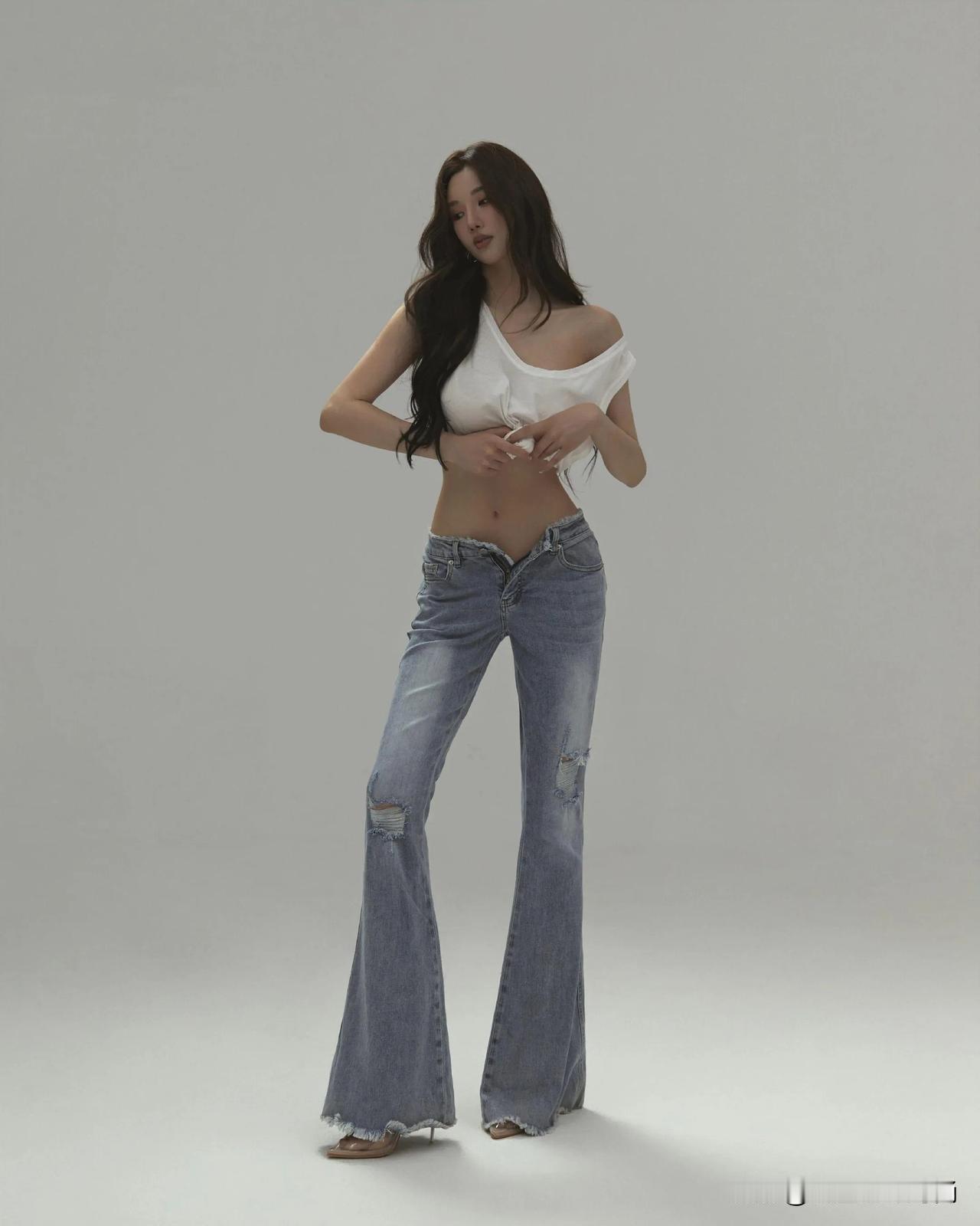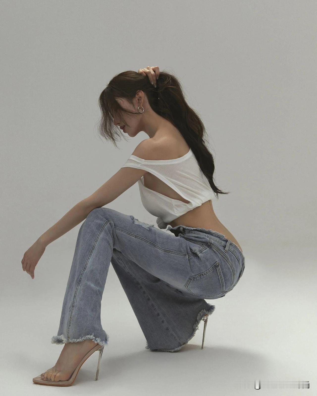 这组穿搭精妙地将简约与个性融为一体,彰显出十足的时尚魅力。上衣是一件白色露肩短款T恤,独特的露肩设计与背后的镂空剪裁相得益彰,既勾勒出精致的肩颈线条,又不经意间流露出一丝小性感。短款版型巧妙地凸显出纤细腰肢,增添了几分俏皮活泼。 下装搭配一条浅蓝色毛边阔腿牛仔裤,宽松的裤型加上裤脚的毛边设计,复古又随性,恰到好处地中和了上衣的修身感,营造出一种慵懒自在的氛围。 鞋子选了一双透明细跟高跟鞋,透明材质轻盈又精致,细跟设计提升了整体气场。它与牛仔裤搭配在一起,碰撞出混搭的时尚火花,让整个造型在休闲中不失精致优雅,能轻松适配多种场合。无论是日常出门逛街,还是约会聚会,都能展现出独特的时尚态度。