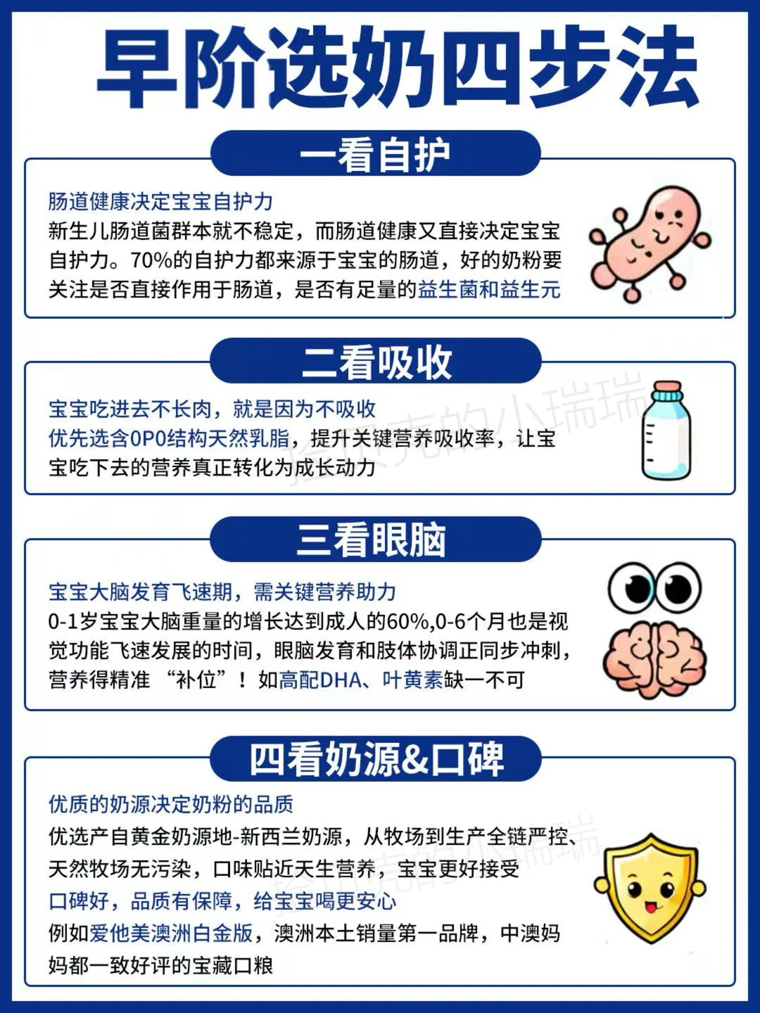 相信新手爸妈👩们都纠结过:宝宝口粮怎么选?我也曾跟风乱买,结果宝宝👶肚肚不适、哭闹不止,让我一整个焦头烂额 刷到崔玉涛老师的科普才明白,新生儿肠道发育不完善,有益菌群不稳定,就像没筑牢的城墙,一旦有波动,有害菌就容易“乘虚而入”。选奶粉的核心,是要帮宝宝稳住肚肚、筑牢肠道防线——最好选择含有“益生菌+益生元”的配方 慢慢我就摸清了选奶的底层逻辑,总结出4️⃣步法(参考图4);照着这个思路,真的能避开90%的坑! 首先看自护!对比多款奶粉后我选择了菌元齐全的爱他美澳洲白金版。它添加了超240亿高活亲源菌,这种菌天然存在妈妈产道和健康宝宝肚肚中,能直达肠道深处发挥作用,配合爱他美专研的双核9:1黄金配比自护益生元,含量13.1g/L接近天生营养,能让有益菌数量1.6倍蹭蹭长,对外还能2.7倍激发自护因子,实证12周就能帮助宝宝强韧自护屏障。现在宝宝肚肚环境舒适,自护力明显提升,每天都活力满满的! 想让自护力更扎实,那就要让营养都能被宝宝充分吸收利用!澳爱添加的OPO结构天然乳脂能促进钙和脂肪的吸收。娃1️⃣个月的时候才3KG小小一只,换这款后直接卡进优秀线,果断一直喝到现在! 0-1岁宝宝大脑重量能达到成人的60%,0-6个月也是视觉功能飞速发展时期,眼👁️脑🧠营养要趁早补,澳爱的DHA是爱他美最高配,有185mg/100g,帮助宝宝五维智力发展+4分!宝宝在早教中心总被夸小脑袋瓜转得快;还有高配8倍叶黄素,高达防90%蓝光,宝宝平常看平板学早教,我也可以放心了 澳爱的口碑也是没的说!我身边的宝妈都在给宝宝喝,网上都是好评!在澳洲也是本土销量第一品牌,不愧是中澳妈妈一致好评的宝藏口粮!还是100%纯净新西兰奶源,口感贴近天生营养,娃每次都喝个精光 现在就一整个街溜子,降温别的宝宝都在家她也要出门,还主动和邻居打招呼,肉嘟嘟的直被夸养得好,希望这篇能帮到纠结的姐妹,咱们都能给娃选到对的!