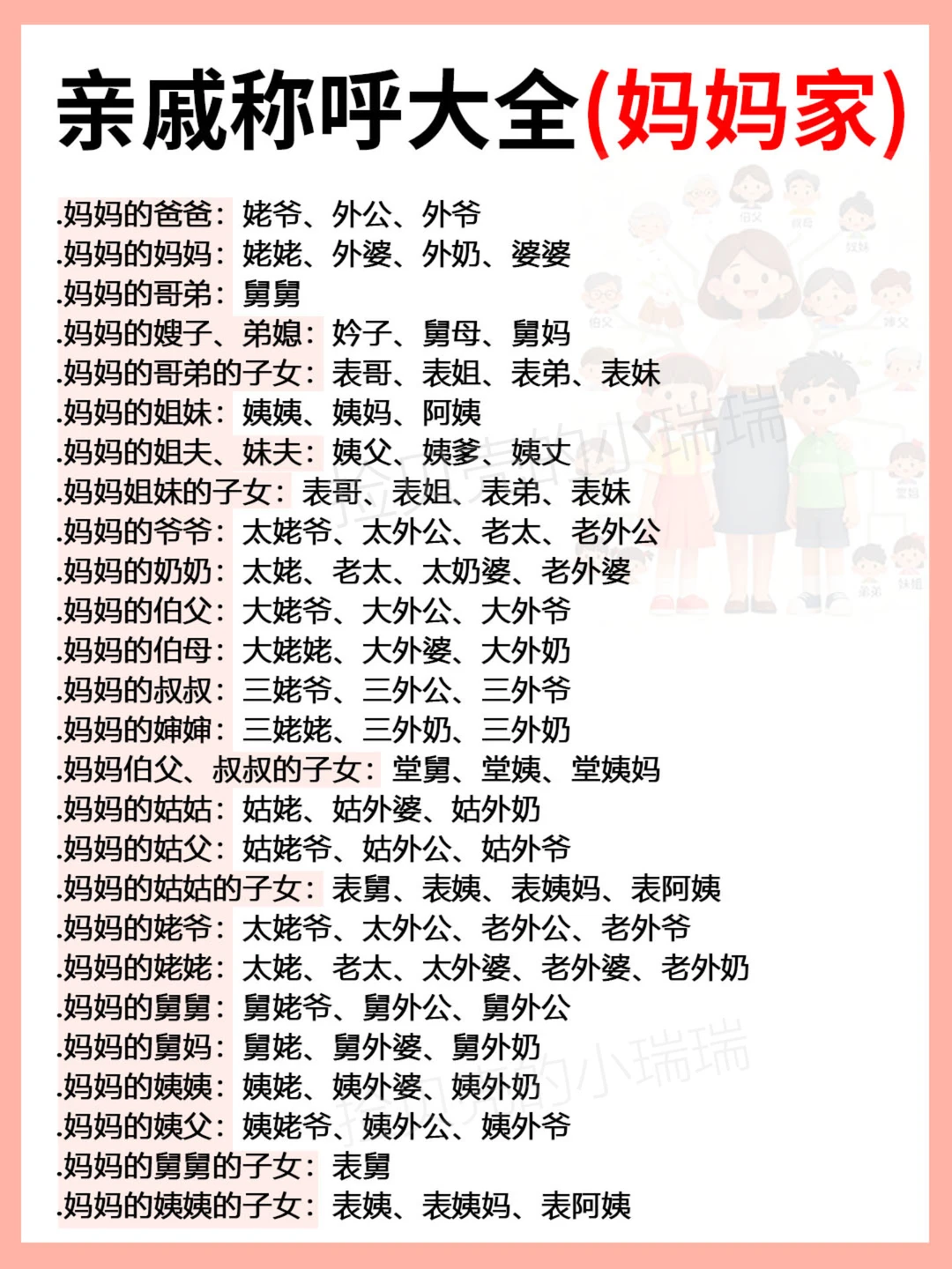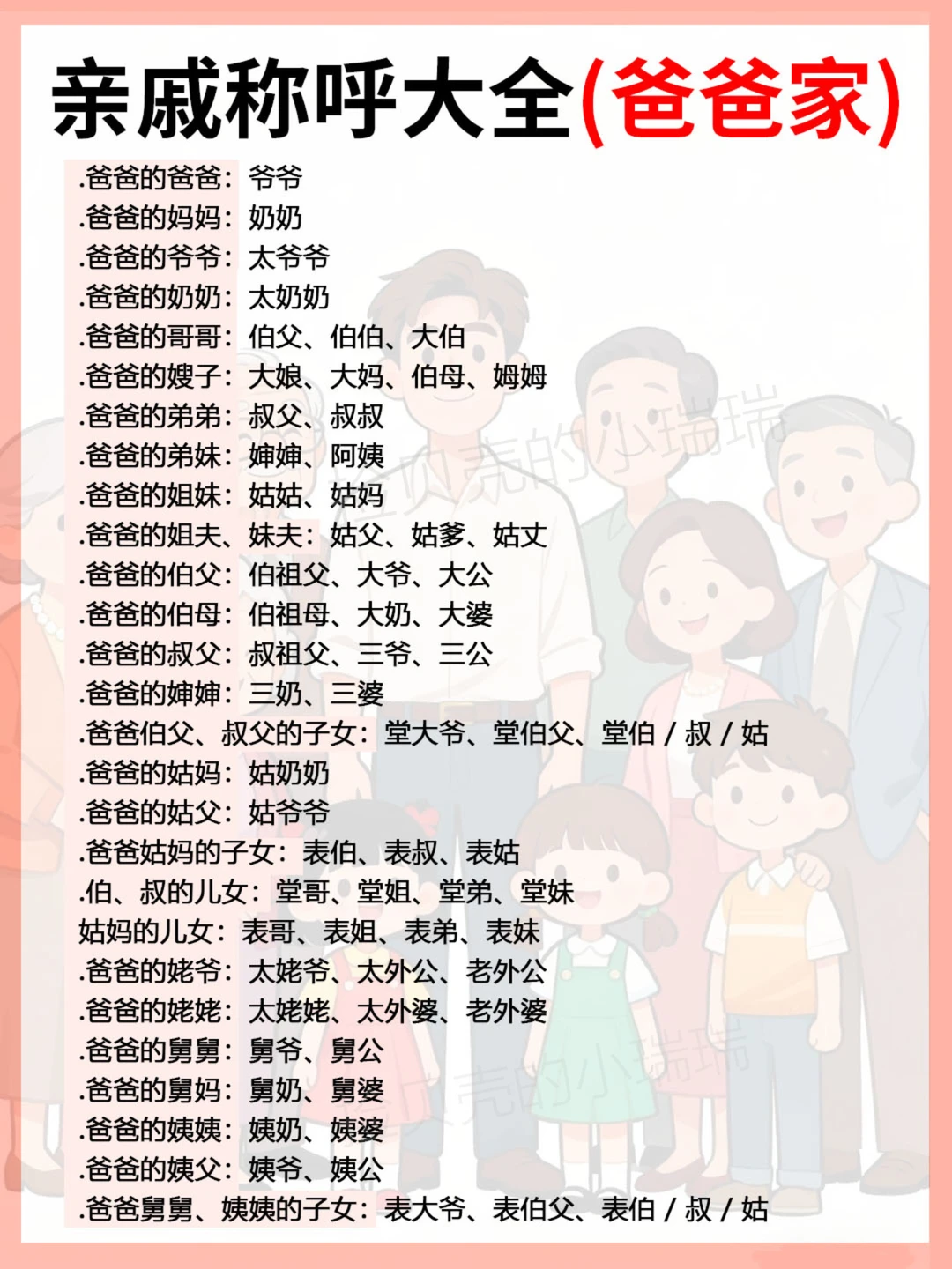 每次遇到亲戚,知道是亲戚,但是不知道该怎么称呼,叫错了尴尬😅,不叫又显得没礼貌,还得等身边的父母提醒,现在有娃了,压力给到自己了 整理了这份亲戚称呼大全,带着孩子一块学,过年可以派上用场