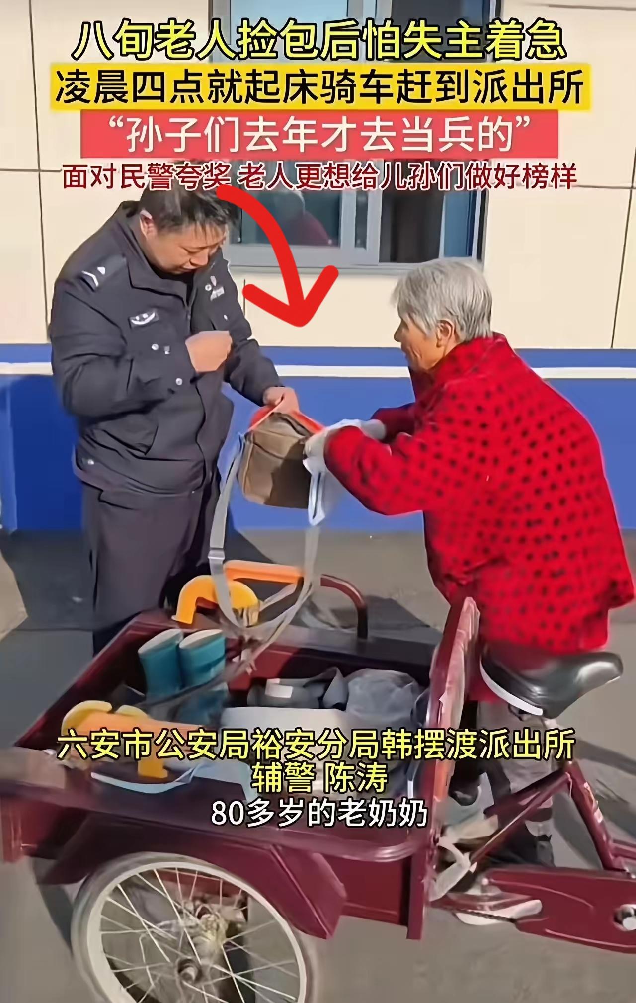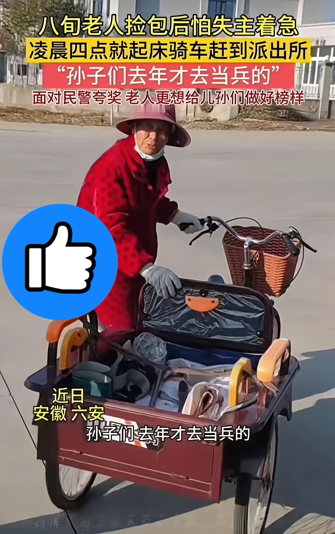 安徽八旬奶奶凌晨4点蹬三轮送钱包!一句话让全网破防 这家风太顶了 安徽派出所凌晨4点多 一阵三轮车轱辘声划破安静 满头白发的老奶奶裹着晨雾赶来 车斗里的雨鞋还沾着泥疙瘩 手上的粗布衣裳洗得发白 指缝里还嵌着农活的泥渍 一进门就把钱包往民警手里递 声音带着喘气:“同志 捡着个包 失主指定急得睡不着” 老人絮叨着 前一晚天黑路远 三轮车蹬着费劲 硬是熬到天蒙蒙亮就出发 怕耽误失主用卡用钱 民警翻开钱包 里面现金和各类卡片整整齐齐 忍不住夸她拾金不昧 老人突然挺直腰板 满脸骄傲:“俩孙子去年当兵了 我得给他们立标杆 不是自己的东西 多一分都不能要” 这话瞬间炸穿全网 网友盯着视频里带泥的雨鞋直呼 老人还在地里刨食赚钱 面对意外之财眼皮都不眨 再看有些老人为点蝇头小利撒泼耍赖 这差距简直天壤之别 八旬高龄本应在家歇着 她却蹬着三轮车 把“堂堂正正”四个字 踩在了清晨的路上 捡的是钱包 守的是良心 传的是家风 老人没说过啥大道理 却用最实在的行动 给孙子们上了最好的一课 物欲横流的当下 这样的朴素善良比黄金还金贵 她的皱纹里刻着规矩 粗糙的手里攥着体面 这才是真·国民奶奶 老人的举动该不该给满分 你捡到装满现金的钱包 会像她一样凌晨赶路送还吗 来评论区说说你的真实想法