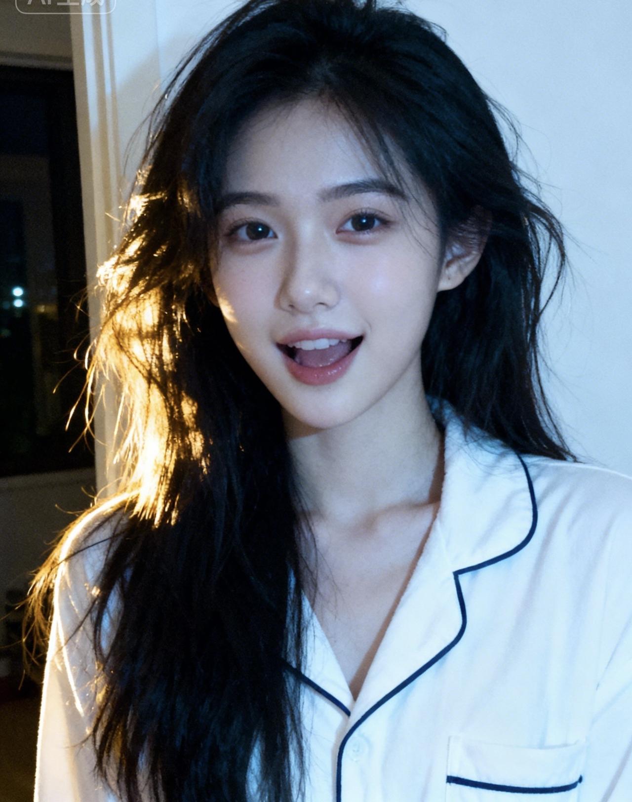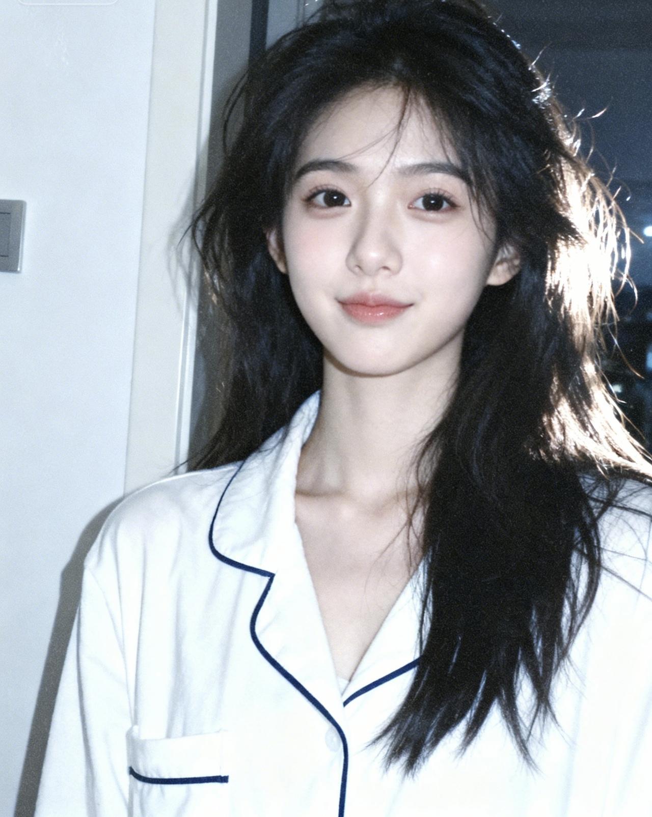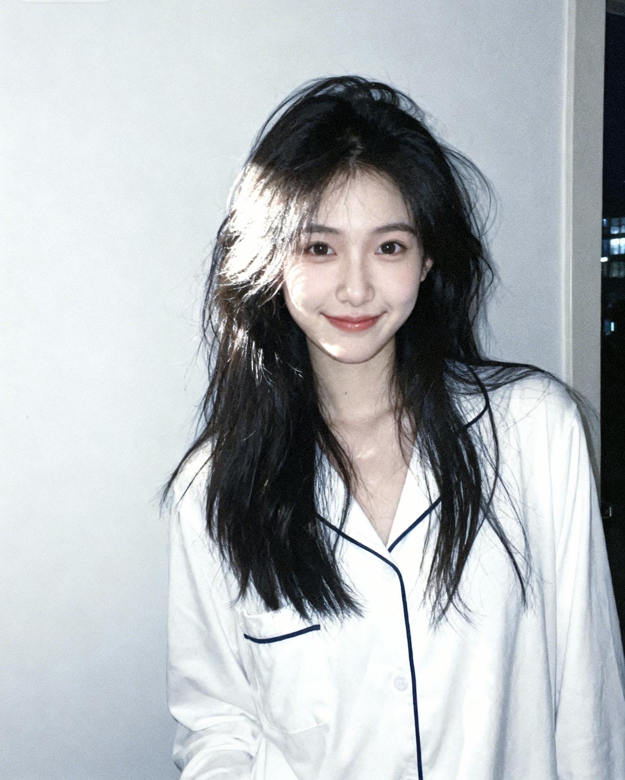 温柔的黑发少女,微笑着面对镜头,仿佛时间在这一刻静止。少女感微笑女孩